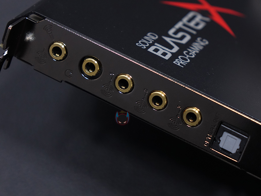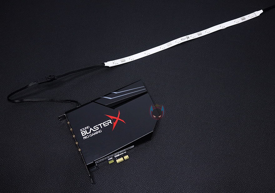 사운드블라스터X AE-5 Plus 역시 내부 칩셋부분들을 보호하기 위해서 메탈 커버를 적용하고 있으며, 오른쪽 한 부분에 크리에이티브 자체에서 지원하는 RGB 라이팅 기술 Aurora를 시각적으로 볼 수 있는 디자인처리가 적용되어 있습니다. 그래서, AE-5 모델때와 마찬가지로 AE-5 Plus에서도 LED 스트립을 제공해주고 있고, 연결방식도 측면 RGB헤더 커넥터에 연결하는 방식으로 동일합니다. 내부쪽 측면에는 RGB 라이팅효과를 위한 P-ATA 전원커넥터와 PC케이스 오디오 포트와 연결되는 커넥터가 배치되어 있으며, PCI슬롯 바깥쪽에는 기본 오디오 및 마이크, 헤드폰, 5.1채널 스피커 오디오, 광출력 포트가 배치되어 있습니다.