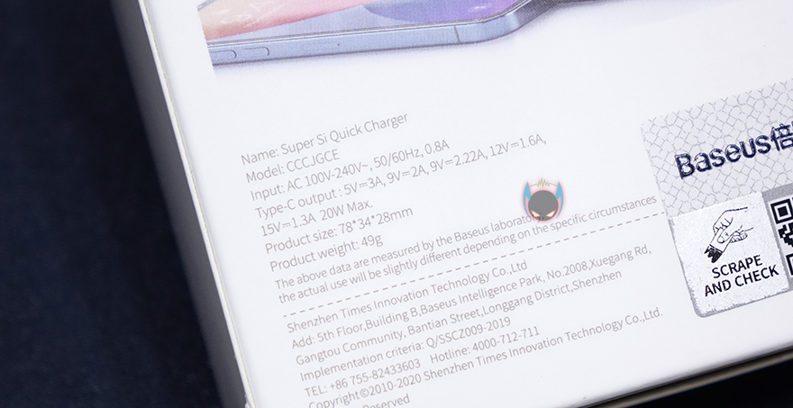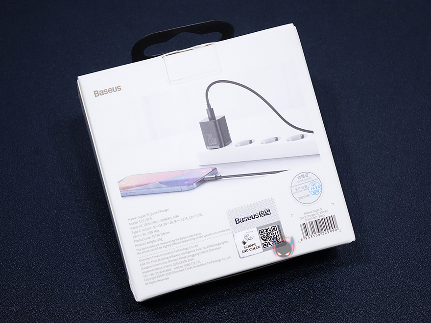 어댑터 액세서리 제품이기 때문에 팩키지 박스자체는 작습니다. 그리고, 제품 이미지도 실려있어서 구입 전에 디자인을 미리 확인할 수 있죠. 모델명과 함께 20W 고속충전 지원임을 알 수 있고, 박스 측면에는 제품 특징들이 표기되어있는데, 고속충전을 지원하는만큼 과전압이나 과전류 같은 방지를 위한 보호회로 기술이 적용되었다라는 것을 짐작할 수 있습니다. 박스후면에는 간략하게 제품사양을 표기해놨는데, 최대 20W 충전지원으로 정확히는 9V=2.22A 기준으로 19.98W까지 지원합니다.