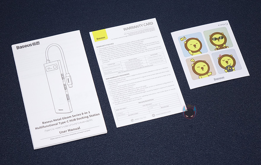 박스를 열어보면, 메탈 글림 USB 허브는 비닐 포장과 함께 흔들리지 않게 틀-포장재를 사용해 포장되어 있으며, 별도의 속박스에는 제품 설명서, 보증서, 스티커를 담고 있습니다. 설명서를 제외하면 보증서와 스티커는 베이스어스 제품에서 늘 보는 구성품이죠.