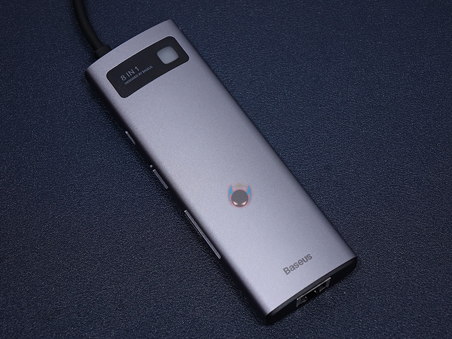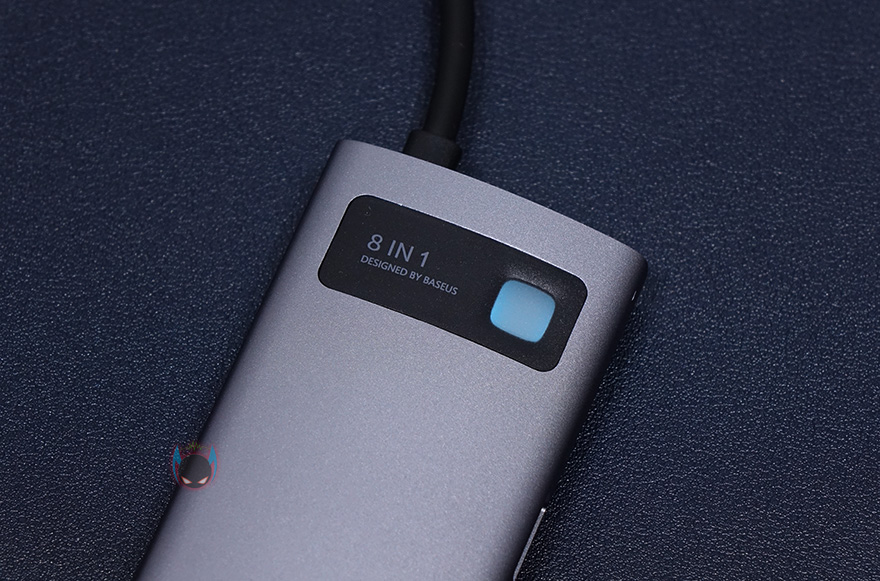 본체를 좀 더 살펴보면, 케이스 재질을 알루미늄 합금으로 보통 액세서리 제품에 이런 재질을 사용하면 기본적으로 고급스러운 느낌이 나죠. 그리고, 윗부분에는 8-in-1 표기와 함께 오른쪽에 연결상태를 보여주는 LED 램프가 적용되어 있습니다. 참고로, 뒤에서 확인하겠지만, 작동시 램프 색상은 블루입니다. 그리고, 왼쪽 측면에는 기본으로 갖추는 USB Type-C 포트와 HDMI 포트 외에 SD카드와 TF카드 슬롯이 8-in-1 제품에 추가로 있으며, 반대쪽 측면에는 USB 3.0 포트가 총 3개 적용되어 있습니다. 참고로, USB Type-C 포트는 충전 겸용으로 PD 100W까지 지원하며, HDMI 포트는 4K 해상도까지 지원합니다. 그리고, SD와 TF카드슬롯은 최대 60MB/s 전송속도를 지원하고, USB 3.0 포트도 최대 500MB/s 전송속도를 지원하죠. 물론, USB 3.0 포트도 5V/1.5A의 충전 지원을 합니다. 그리고, 본체 아랫부분에는 RJ-45 랜 포트가 적용되어 있는데, 1,000ㅡbps까지 지원하죠.