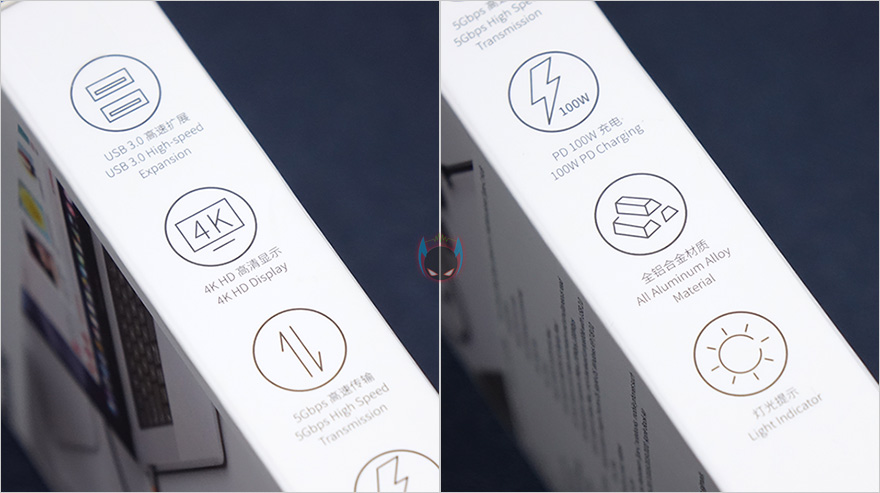 제품팩키지 형태는 박스형태로 전면에 제품 이미지와 함께 메탈 글림(Metal Gleam) 시리즈라는 문구를 확인할 수 있습니다. 참고로, 이 메탈 글림 시리즈 USB 허브는 4-in-1부터 8-in-1까지 총 4가지 모델로 나왔습니다. 이부분은 뒤에서 다시 한 번 언급하기로 하고, 필자가 접한 모델은 최대인 8-in-1 모델인데, 모델명과 함께 박스 한쪽 측면에 어떤 포트들이 갖추고 있는지 미리 확인할 수 있습니다. 그리고, 반대쪽 측면에는 갖추고 있는 포트들로 지원되는 기능들을 표기하고 있죠. 박스 후면에도 제품 연출 이미지와 함께 제품의 기본 사양을 자세히 표기해놨기 때문에, 액세서리 제품군으로 구입하기전 충분히 정보를 얻을 수 있겠습니다.