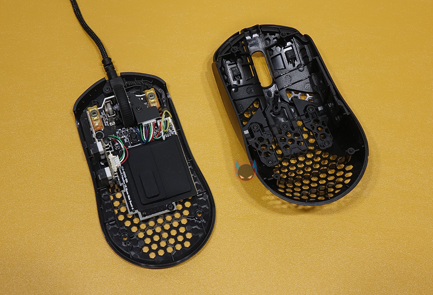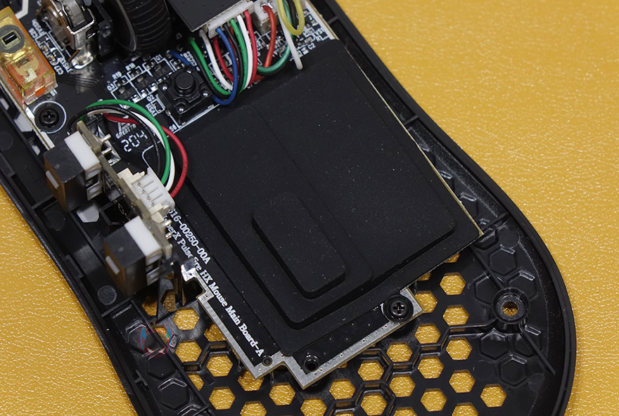 이번엔 하이퍼X 펄스파이어 헤이스트 게이밍마우스의 내부를 잠깐 살펴보는데, 내부 마감처리는 상당히 깔끔하며, 좌우버튼의 클럭 정확도를 위해 버튼 커버 안쪽 클릭 위치부분은 ㅁ자 형태로 처리된 것을 확인할 수 있습니다. 그리고, 센서과 MCU칩셋이 위치한 부분에는 팜-레스트부분의 타공망처리가 적용되어 있기때문에 외부로부터 먼지 유입 많아지거나 불순물 유입방지를 위해 고무 쉴드처리를 해놨으며, 좌우버튼 스위치도 일반적으로 많이 사용되는 옴론스위치가 아닌 TTC 스위치로 역시 평범한 스위치가 아닌 방진코팅이 적용된 고급 스위치를 사용했습니다. 참고로 클릭수명은 6천만회입니다. 그리고, 측면버튼은 아직 알려지지 않은 브랜드의 스위치를 사용했습니다.