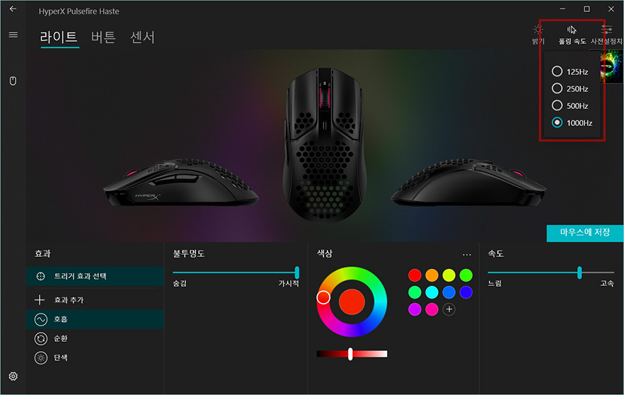 펄스파이어 헤이스트 역시 하이퍼X의 공용 소프트웨어 NGenuity를 지원하는데, 연결된 상태에서 프로그램을 실행해보면 메뉴는 크게 라이트/버튼/센서로 기존의 자사 마우스 제품들과 큰 차이는 없습니다. 다만, 라이트 같은경우에는 아무래도 훨-버튼에만 RGB효과를 적용해놨기 때문에, 효과모드는 트리거할 때를 포함해 총 4가지정도만 지원하고 있습니다. 이 밖에 버튼메뉴에선 기본 좌우버튼은 서로 기능을 바꿀 수 있고, 나머지 휠-버튼과 측면버튼, DPI 버튼은 키보드기능부터 매크로 등 크게 6가지 기능으로 변경할 수 있게 지원하고 있습니다. 그리고, 센서 메뉴에선 DPI값을 설정할 수 있는데, 최소 200~최대 16,000 DPI까지 100단위로 조절할 수 있습니다. 그리고, 전송제어속도도 4가지 중 선택할 수 있습니다.