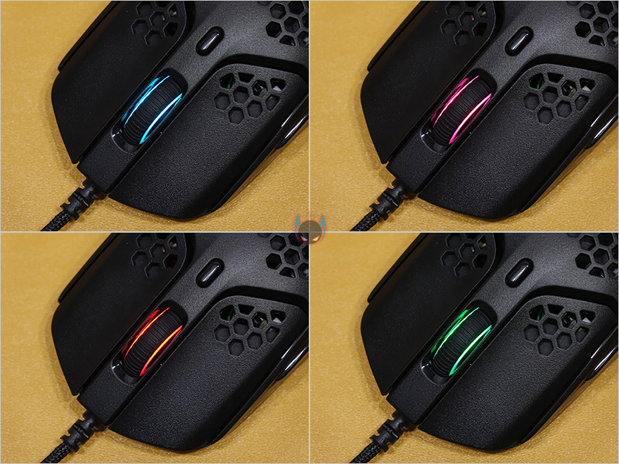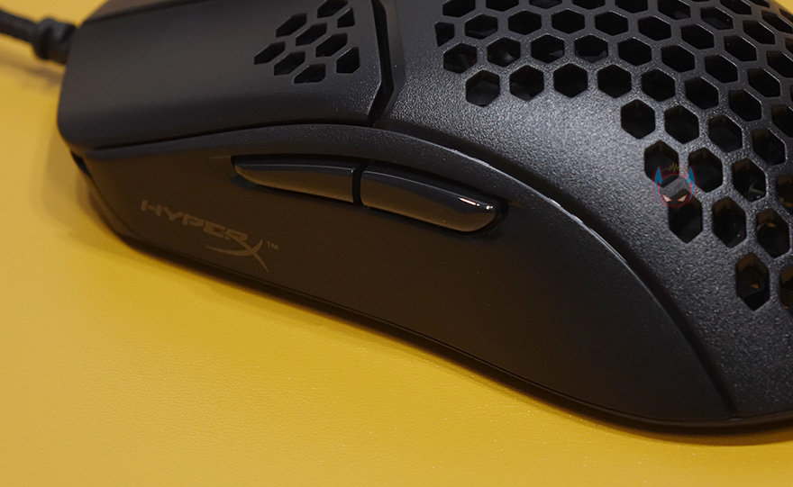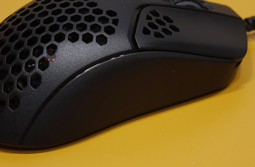 그리고, 펄스파이어 헤이스트 역시 무게를 줄이는 방법으로 다른 경쟁사 제품들처럼 타공망 디자인을 적용했는데, 손바닥과 맞닿는 팜-레스트 부분이 가장 많은 타공망 처리가 되어있으며, 기본 좌우버큰 클럭부분 역시 뒷부분에 타공망처리를 일부 해놨습니다. 또한, 클릭 정확성을 위해 각 버튼 커버는 분리설계로 적용되었고, 가운데 휠-버튼 부분은 뒤에서 확인하겠지만, 유일하게 라이팅 효과를 볼 수 있는 부분입니다. 그리고, 그 뒤로는 DPI 버튼이 배치되어 있죠. 물론, 좌우버튼의 그립이 기본형태에서 부족하다 싶으면 추가로 제공되는 그립 테이프를 부착하면 됩니다.