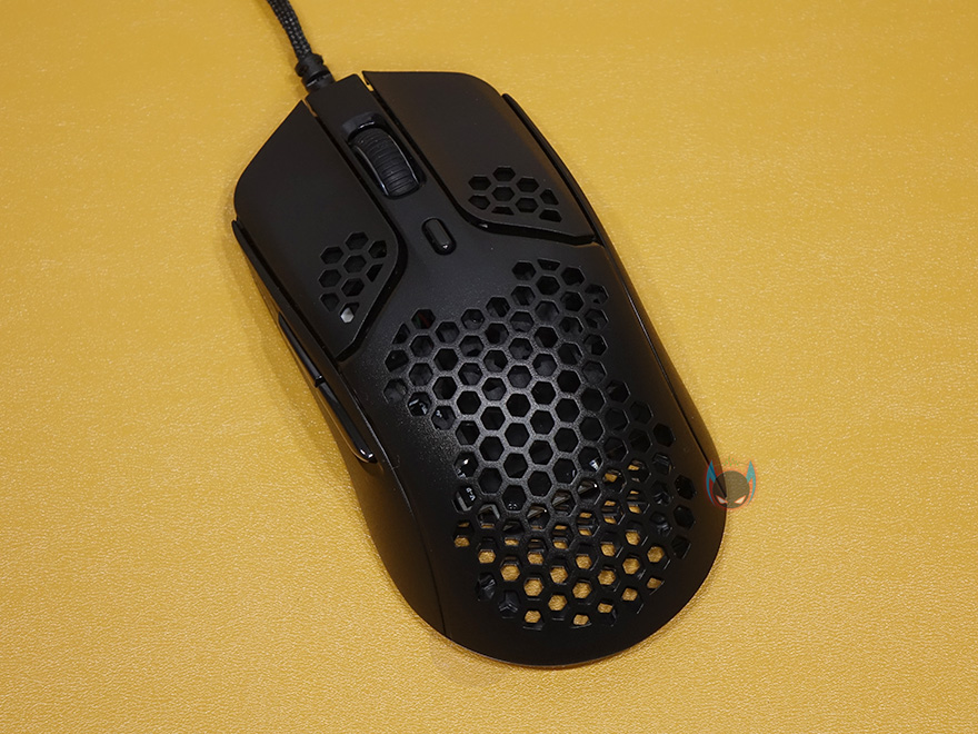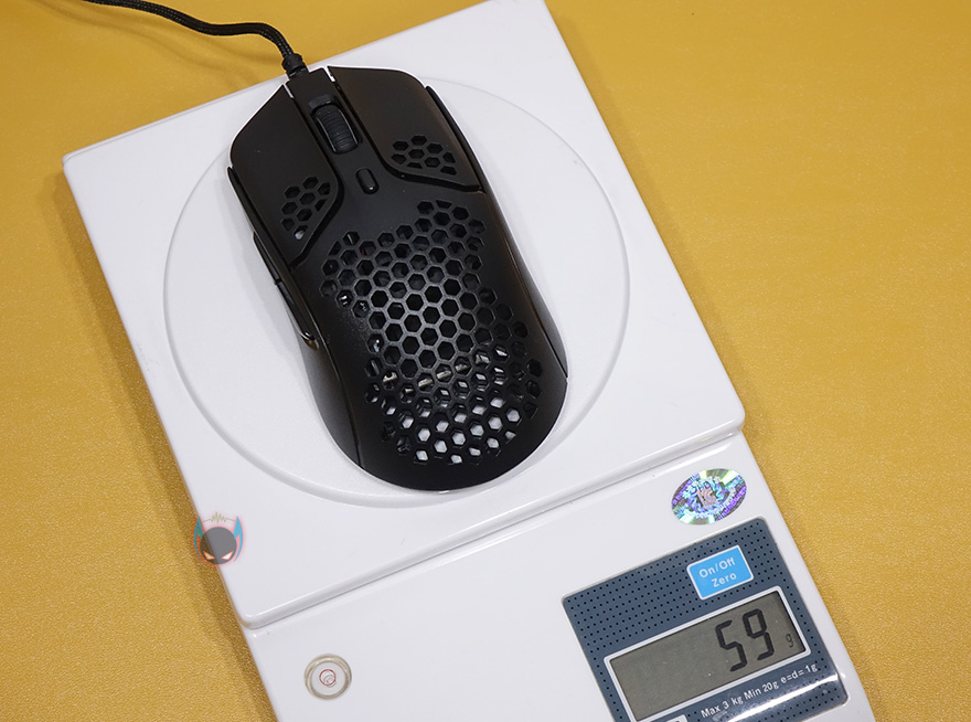 그럼, 하이퍼X의 펄스파이어 헤이스트 게이밍 마우스 외형을 살펴보면, 색상은 올-블랙이며, 무게는 앞서 주요 특징에 표기했던 것처럼 케이블을 제외한 마우스 자체의 무게는 59g입니다. 일반적으로 현재 초경량 게이밍마우스라면 보통 60g대 범위에서 많이 적용하는데, 이 제품은 1g이 더 적은 50g대 무게로 적용한거죠. 초경량 마우스라고해서 무조건 가벼울수록 좋은 것은 아닙니다. 너무 가벼우면 오히려 마우스 그립감각을 느끼지 못하기 때문에 컨트롤이 쉽지 않습니다.
