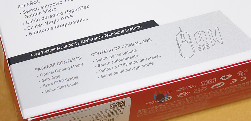 제품팩키지부터 살펴보면, 늘 그래왔듯이 하이퍼X 제품들은 박스 전면에 제품이미지를 담고 있죠. 펄스파이어 헤이스트 마우스 역시 박스 전면에 제품 이미지를 담고 있어서, 모델명과 함께 미리 디자인을 확인할 수 있는데, 초경량 마우스컨셉답게 타공망 디자인을 적용하고 있습니다. 이부분은 좀 더 실물 확인해서 다시 언급하고, 제품의 주요 특징으로는 59g의 가벼운 무게, 케이블꼬임방지의 파라코드 케이블, Pixart 3335 광센서를 표기해놨습니다. 물론, 요즘 트랜드에 맞춰서 RGB효과와 하이퍼X의 공용 소프트웨어 NGenuity 지원표기도 되어있죠. 조금 특별하다면, 단순히 PC에서만 지원하는게 아니라 콘솔기기에서도 지원한다라는 표기를 확인할 수 있습니다.