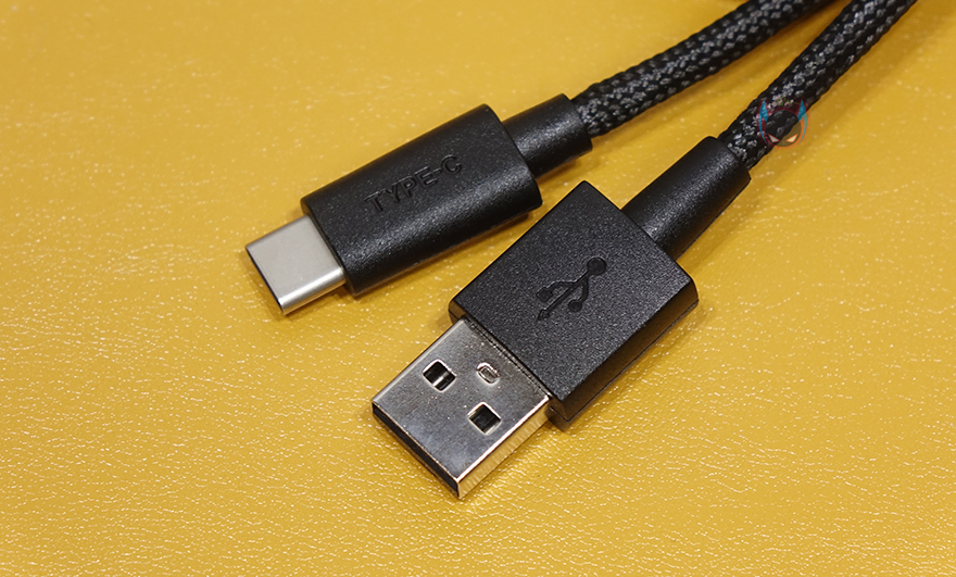 그리고, 키보드 측면에서 보면 타이핑에 최적화라 불리우는 스텝-스컬쳐2 단계배열을 갖추고 있으며, 키보드 밑바닥부분에는 중앙에 하이퍼엑스 로고를 음각으로 표시해놨으며, 각 모서리 부근에 미끄럼방지 고무패드가 부착되어 있습니다. 또한, 앞부분에는 2단 높낮이 받침대도 적용되어 있어서, 기본높이까지 포함해서 총 3단계로 높이조절을 할 수 있습니다. 분리형 USB 전원케이블 길이는 1.8m이고, 꼬임방지를 위해 파라코드 소재가 사용되었으며, 키보드 연결은 Type-C, PC나 콘솔기기쪽 연결은 Type-A 인터페이스를 가졌습니다.
