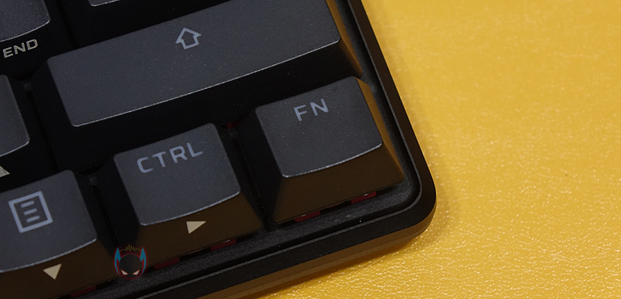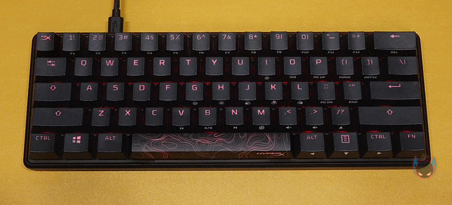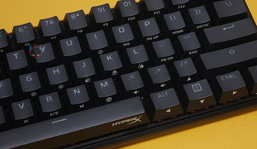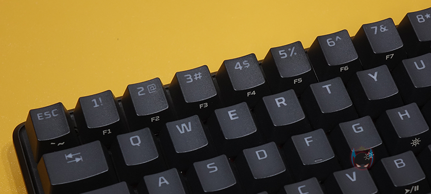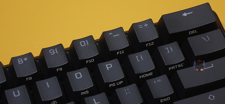 하이퍼엑스 Alloy Origins 60은 60% 미니키보드이기때문에 Fn키 조합으로 부가기능 외에 풀-배열 키보드에서 사용되는 일부 키들도 Fn키 조합으로 사용되는데, 먼저 F숫자키(F1~F12)는 1~0, -, =키와 함께 Fn키 조합으로 사용되며, ESC키는 `,~ 2가지 표시되어 있는데, Fn키 조합으로 사용하면 `가 입력되고, Shift키와 사용하면 ~가 입력됩니다. 그리고, Insert/Delete/Home/End/PageUp/PageDown 특수키 6개도 Alloy Origins 60에선 Fn키 조합으로 사용되며, 나머지 부가기능들은 먼저 나온 오리진 시리즈 제품들과 동일한 기능들로 지원해주고 있습니다. I키는 게임모드, G/H키는 밝기조절, J/K/L키는 온보드 프로파일, V/B/N은 재생컨트롤, M/,/./?키는 음소거 및 볼륨조절 기능이 되겠습니다. Fn키 조합으로 사용되는 키들은 모두 키-캡 아래에 표기를 해놨기 때문에 어렵지 않게 사용할 수 있습니다.