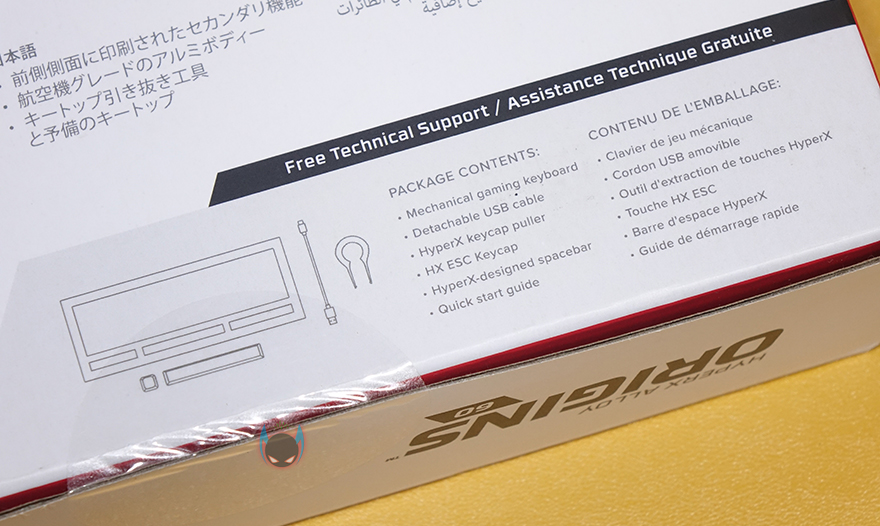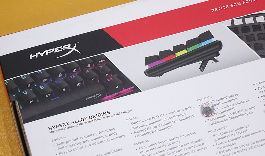 하이퍼엑스 Alloy Origins 60 키보드는 시작에서도 언급했듯이 60% 사이즈를 가졌기때문에, 지금까지 나온 오리진 시리즈 중 제품박스도 가장 작습니다. 그래도 팩키지 디자인은 크게 벗어나지 않는데, 모델명, 사이즈와 함께 눈길을 끄는 문구가 있으니, 바로 PBT재질의 이중사출 키-캡입니다. 뒤에서 다시 언급하겠지만, 제품 기본 키-캡으로 PBT 키-캡을 갖춘 건 이번이 처음이죠. 그리고, 오리진 시리즈의 제품이기 때문에 당연히 하이퍼엑스 자체개발 스위치 HyperX 스위치탑재 문구도 확인할 수 있고, PC와 콘솔기기 호환표기도 확인할 수 있습니다.