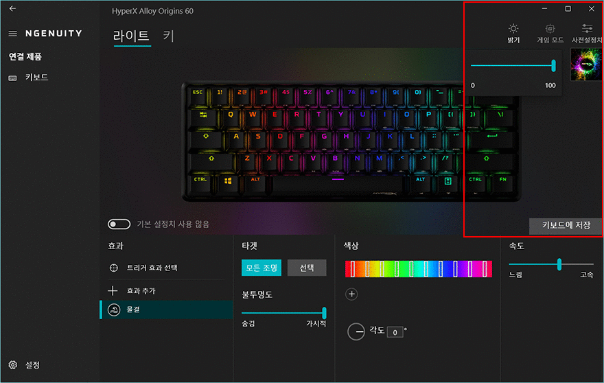 마지막으로 Alloy Origins 60 키보드 역시 하이퍼엑스의 공용 소프트웨어 NGenuity를 지원해주고 있는데, 프로그램을 실행하면 지원되는 기능은 먼저 나왔던 오리진 시리즈 키보드 제품들과 동일합니다. 크게 메뉴는 라이트와 키로 나뉘어지고, 라이트에는 기본상태로 작동되는 루프형 모드에 총 7가지 모드가 있고, 키 입력시 작동하는 트리거형 모드에는 총 3가지 모드를 지원해주고 있습니다. 그리고, 키 메뉴에는 키 기능변경 설정으로 기본 키 기능변경외에 Fn키 기능변경 지원해주고 있어서 구분해서 설정할 수 있습니다. 이외에도 프로그램으로 밝기조절은 1%단위씩 할 수 있으며, 게임모드는 윈도우키 잠금해제 외에 추가 잠금해제 기능들을 활성화/바활성화 할 수 있으며, 프로그램에서 설정한 값은 바로바로 사용할 수 있지만, 온보드 프로파일에도 저장할 수 있습니다.