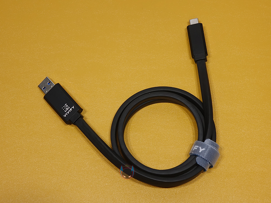 그럼, VIVIFY ACESO W10 USB 케이블을 살펴보면, 케이블 기본색상은 블랙색상이며, 가장 먼저 눈에 들어오는 부분은 바로 케이블의 굵기라할 수 있는데, 일반적인 원형 케이블이 아닌 플랫타입의 케이블로 약 4.5mm의 두꺼운 두께를 가졌습니다. 이는 LED가 적용되었기 때문이라 볼 수 있고, LED는 제품 이미지에서 확인했듯이, 측면에 케이블 길이와 동일하게 적용되어 있습니다. LED 색상은 제품사양 표기에서 확인했듯이 블루/그린/오렌지/퍼플/레드 총 5가지이며, 케이블 길이는 1m 입니다. 그리고 양쪽 USB Type-A와 Type-C 인터페이스부분에 모두 VIVIFY 로고를 새겨놨으며, 측면에 LED 색상 구분표시도 되어있죠.