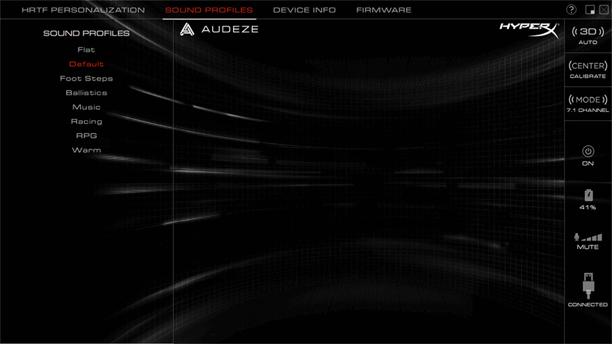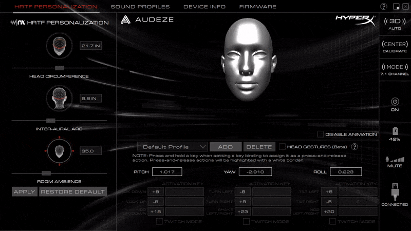 앞에서도 여러 번 언급했듯이, 하이퍼엑스 클라우드 오르빗 S(Cloud Orbit S) 게이밍 헤드셋의 가장 큰 특징은 오디지(Audeze)와 합작. 다시말해, 오디지의 Waves Nx 3D 오디오와 Waves Nx 헤드 트래킹 기능이 적용되었다라는 것을 말하는데, 참고로 기본 모델인 클라우드 오르빗(Cloud Orbit)은 Waves Nx 헤드 트래킹 기능이 없습니다. 두 모델의 가장 큰 차이점이죠. 그리고, PC에서 사용할 때는 이 두 기술이 오디지(Audeze)의 기술이기 때문에, 기존의 하이퍼엑스 공용 S/W NGENUITY가 아닌 Orbit 전용 S/W를 제공해주고 있습니다. 프로그램을 실행해보면, 인터페이스부분에 입체모양의 헤드이미지를 볼 수 있는데, 바로, 착용한 사용자의 머리 움직임에 따라 인터페이스에서도 그대로 애니메이션으로 보여줍니다. 물론, 애니메이션을 끌 수도 있죠. 이렇게 착용한 사용자의 머리 움직임을 감지하는게 Waves Nx 헤드 트래킹 기능입니다. 또한, 프로그램에는 이 기능 외에도 다양한 사운드 설정이 적용된 8개의 프로파일을 제공해주고 있으며, 프로그램정보와 펌웨어 업데이트 기능도 갖추고 있습니다. 조금 아쉬운 점이라면, 프로그램 언어가 모두 영어이기때문에, 초보사용자는 프로그램 기능을 익히는데 조금 시간이 필요할 것 같습니다.