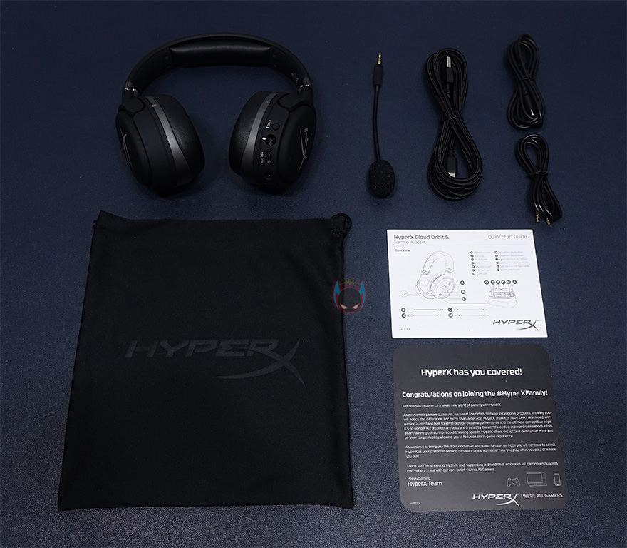 제품박스 뒷면에는 주요 특징을 각 나라별 언어로 표시하고 있으며, 추가적인 제품 이미지를 확인할 수 있는데, 분리형 마이크와 전원케이블 연결을 담았습니다. 그리고, 뒤에서 다시 확인하겠지만, 전원케이블이 무려 3개나 제공되고, 유명 음성 채팅 프로그램들 인증도 받았다라는 것을 확인할 수 있습니다. 하이퍼엑스의 대부분의 게이밍헤드셋 제품들이 최소 2개이상의 음성 채팅 프로그램 인증을 받고 있죠. 제품포장은 고급형 모델답게 속박스와 함께 제품 보호를 위해 스펀지를 사용했으며, 제품 구성은 클라우드 오르빗 S(Cloud Orbit S) 헤드셋, 분리형 마이크, USB Type-A 케이블, USB Type-C 케이블, 3.5mm 오디오 케이블, 전용 파우치, 제품설명서/보증서로 이루어져 있습니다. 물론, 제품 설명서에는 한국어도 포함되어 있죠.