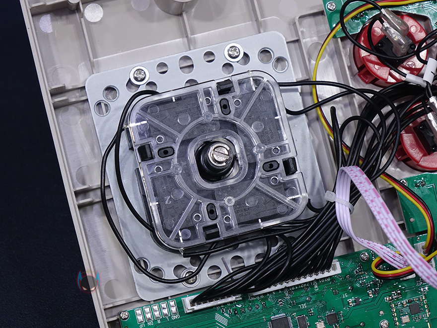 밑바닥부분에 나사구멍을 확인할 수 있는데, 참고로 육각나사로 모두 풀면 쉽게 케이스를 분해할 수 있습니다. 내부를 잠깐 보면, 바닥부분에는 무게감을 가질 수 있게 메탈재질의 보강판이 들어가 있으며, 레버 방향각은 4각으로 대부분 구매자들이 이부분에서 아쉬워해서 따로 무각이나 8각으로 교체하는 경우가 많습니다. 온라인 같은 곳에서 대략 1만원정도에 구입해서 교체할 수 있죠.