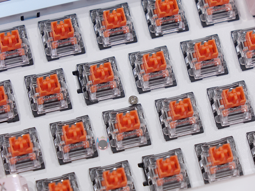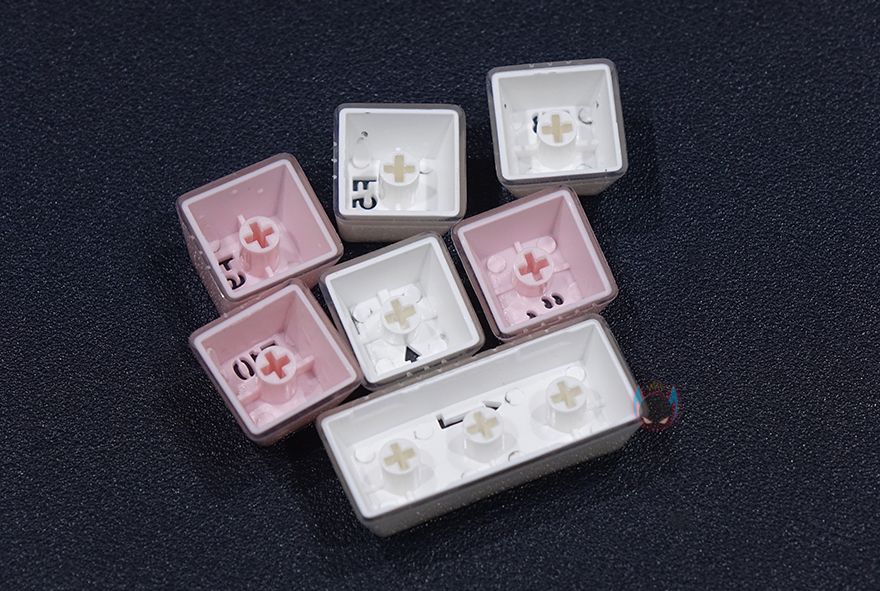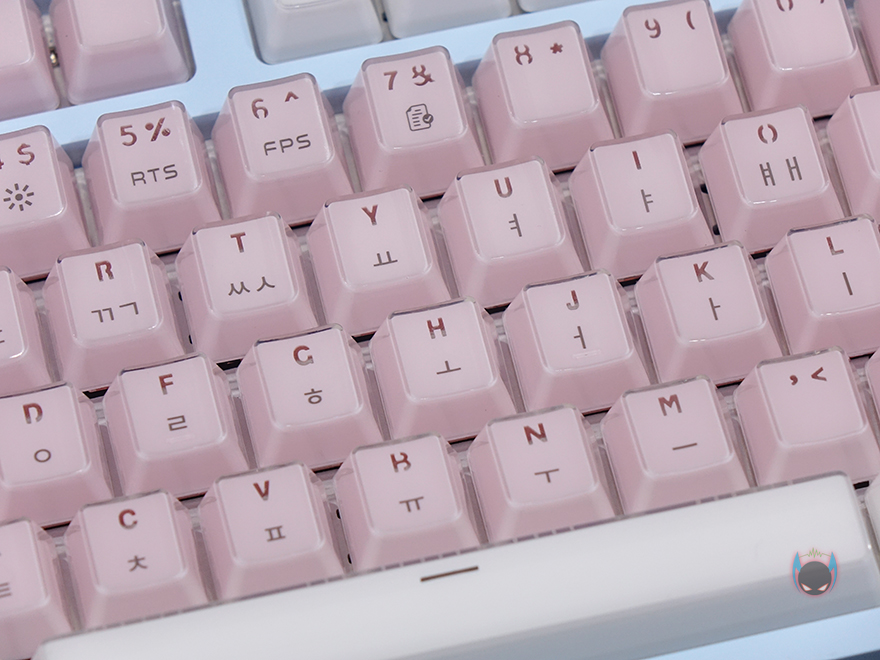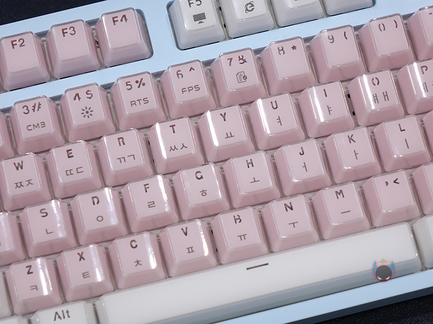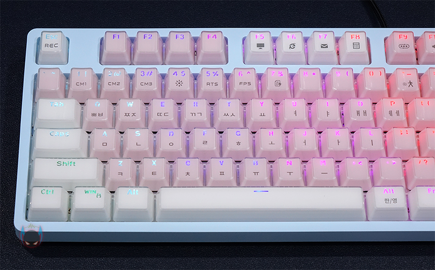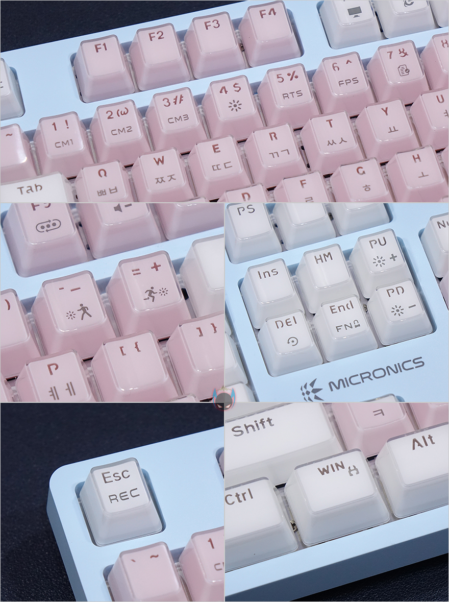 그리고, 키-캡 역시 이 제품의 주요 특징이라 할 수 있는데, 바로 크리스탈 키-캡으로 안쪽에는 색상을 바깥쪽에는 투명함으로 이중 사출방식의 키-캡입니다. 사실 크리스탈 키-캡은 이전부터 마이크로닉스의 다른 키보드 제품에서도 적용되고 있죠. 실제로 빛이 없는 곳에서 보면 코팅한 느낌을 주고, 빛이 있으면 말그대로 크리스탈 느낌을 주는 것이 이 키-캡의 특징이라 할 수 있습니다. 이중사출 방식이라 두께(약1.6mm)도 좀 있죠. 그리고, 스위치는 마닉 4세대 광축으로 1~3세대를 거치면서 개선된 가장 최신 마이크로닉스의 광축으로 1억회 클릭수명, 키 입력속도 향상, 방진력 향상의 택타일 타입입니다. 또한, 스페이스-바 같은 긴 키들의 스테빌라이저는 체리식으로 적용하고 있습니다.