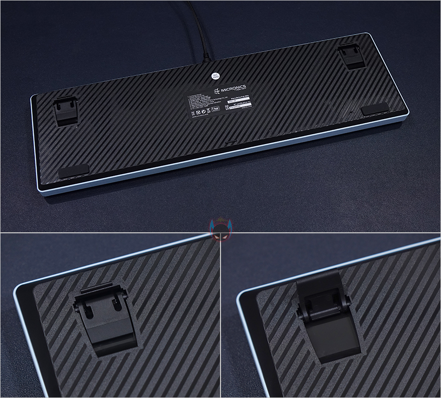 키보드 측면에서 보면 타이핑의 최적화라 불리우는 스텝-스컬처2 단계 배열을 갖추고 있으며, 키보드 밑바닥부분에는 미끄럼방지 고무패드부착과 양쪽 앞부분에 높낮이 받침대가 적용된 것을 확인할 수 있으며, 끝으로, 케이블은 총 1.5m 길이에 꼬임방지를 위해 직조케이블을 사용했으며, 신호손실 최소화를 위해 노이즈 필터도 적용되어 있죠. 연결 인터페이스방식은 USB방식입니다.
