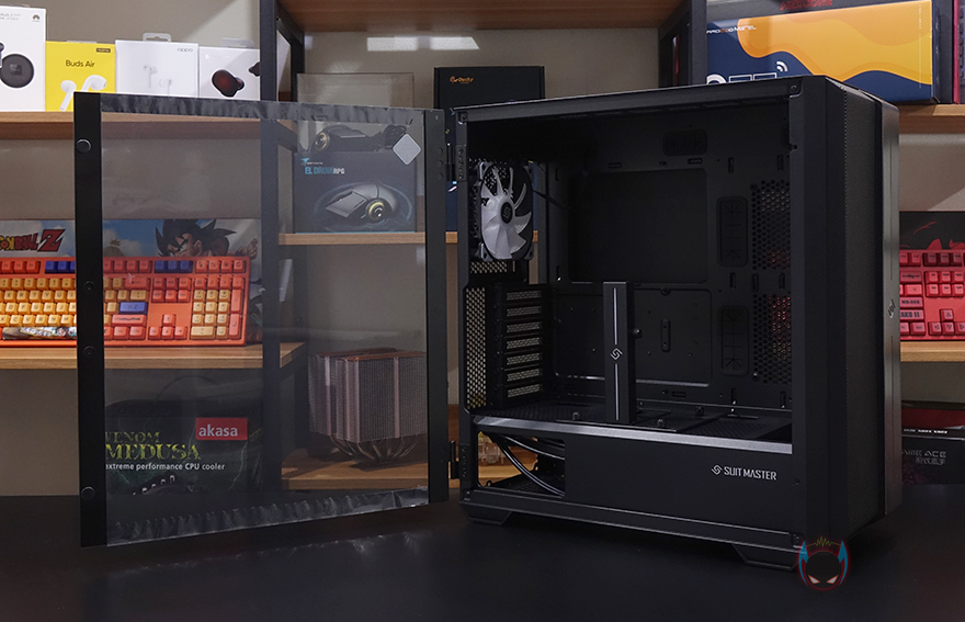 P2000 퍼포먼스 PC케이스의 사이드패널은 전면에서 봤을 때 오른쪽 패널은 샤시 패널로 앞부분에 내부 추가 쿨링효과를 볼 수 있게 에어홀 처리를 해놨으며, 왼쪽 패널은 강화유리를 적용하고 있습니다. 당연히 강화유리 패널에는 개봉시 기본 비닐이 부착되어 있는데, 비교적 기포없이 깨끗하게 부착되어 있어서, 굳이 바로 제거할 필요는 없겠습니다. 왜냐하면 여전히 강화유리 PC케이스 제품들이 강화유리 파편방지를 위한 비산필름을 기본 부착해서 출시하고 있지 않으니깐요. 물론, 포장시 보호비닐 제거는 사용자의 선택 몫입니다. 그리고, 강화유리 패널은 앞부분에 손잡이를 적용해서 도어방식으로 열리고, 힌지부분도 분리가 가능해, 강화유리는 따로 분리할 수 있죠.