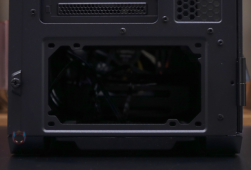 케이스 후면에는 후면 배기역할을 위해 에어홀 처리와 함께 내부에 120mm 팬이 기본 장착된 것을 확인할 수 있으며, 팬 상하위치조절이 자유롭도록 긴 나사홀로 처리를 해놨습니다. PCI슬롯은 미들타워 기준인 7개를 갖추고 있으며, 맨 아래 파워서플라이 자리에는 상하방향 모두 장착이 가능하게 나사홀이 적용되어 있죠. 끝으로, 케이스 외부 밑바닥부분에는 파워서플라이 자리에 분리형 먼지 필터가 적용되어 있으며, 앞부분에는 내부에서 확인하겠지만, 내부 3.5인치 HDD베이 고정나사와 함께 위치이동이 가능하도록 해놨으며, 케이스 받침대에는 고무패드부착과 함께 약 20mm 높이를 가지고 있습니다.