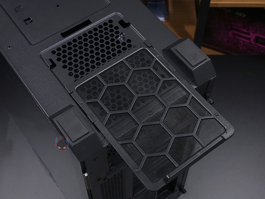 케이스 상단에는 자석방식의 먼지필터가 부착되어 있는데, 분리하면 상단쿨링 효과를 위해 에어홀 처리와 함께 추가로 팬이나 수냉쿨러 사용시 라디에이터를 장착할 수 있게 나사홀 처리도 되어있죠. 참고로 팬은 140mm경우 최대 2개, 120mm 경우 최대 3개, 라디에이터도 최대 360mm까지 장착할 수 있습니다. 그리고, 상단 오른쪽에는 버튼 및 포트가 배치되어 있는데, 맨 앞부분에 전원버튼을 시작으로 뒤로 리셋버튼, 작동상태 LED램프, EAR/MIC 포트, USB 3.0 포트, USB Type-C 포트, LED 모드전환 버튼이 배치되어 있습니다.