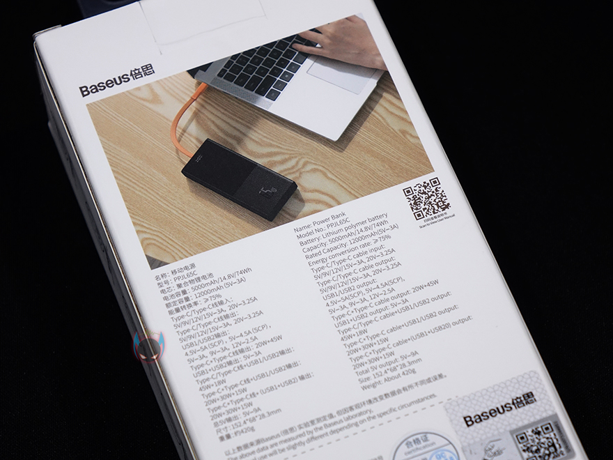 제품 팩키지형태는 기존의 자사 제품들처럼 박스형태로 전면에는 제품 이미지를 담고 있는데, 기존 제품과 다른 점이 한가지 있다라는 것을 쉽게 짐작할 수 있습니다. 바로, 충전케이블이 적용되어 있다라는건데, 이부분은 뒤에서 다시 언급하도록 하고, 모델명에는 배터리용량 표기와 함께 최도 65W 충전지원도 확인할 수 있습니다. 또한, 박스 측면에는 제품의 주요특징으로 입/출력 모두 65W 출력 지원, 삼성 제품 최대 45W 지원, 3개의 고속충전 포트, 배터리용량, 디지털 디스플레이, TPE 케이블을 표기하고 있죠. 물론, 박스후면에 연출이미지와 함께 제품의 기본 사양 표기도 확인할 수 있는데, 각 포트의 입/출력 지원부터 배터리 무게까지 상세하게 표기해놨습니다.