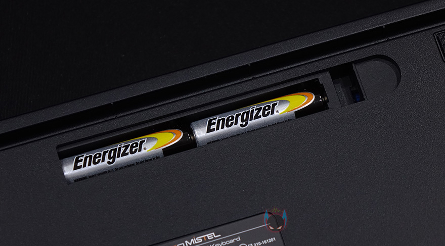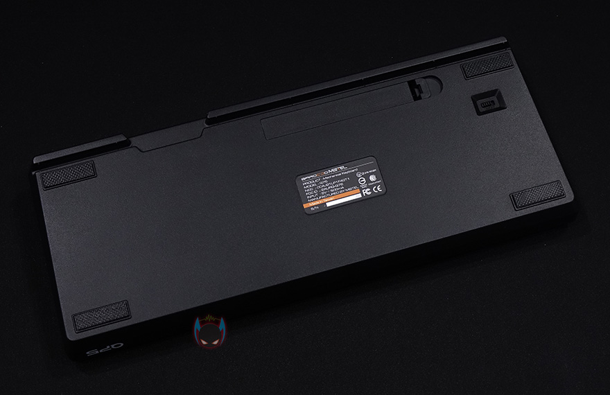 이번엔 하우징 그러니깐 케이스부분을 살펴보면, 오른쪽 하단부에는 모델명을 새겨놨으며, 전면에서 봤을 때 왼쪽부분에 유선 사용시 연결되는 USB Type-C 포트가 배치된 것을 확인할 수 있습니다. 그리고, 키보드측면에서 보면 타이핑의 최적화라 불리우는 스텝-스컬처2 단계배열을 갖춘 것을 확인할 수 있죠. 참고로, 배열 맨 아랫부분의 높이는 23.4mm입니다. 그리고, 키보드 밑바닥부분에는 모서리 부근에 미끄럼방지 패드를 부착해놨으며, 무선 사용시 배터리가 사용되기 때문에 한쪽에 AAA 건전지 2개가 사용되는 수납공간이 있으며, 바로 아래에 무선 On/Off 스위치도 적용되어 있죠. 배터리까지 장착했을 때 키보드의 무게는 약 786g 입니다.
