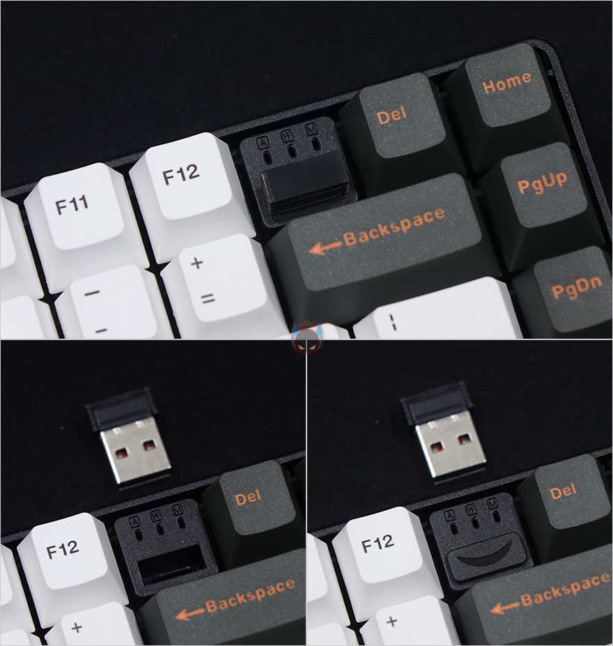 자판 부분을 좀 더 살펴보면, F12키 바로 오른쪽에는 무선 사용시 필요한 일명 동글이라 부르는 2.4GHz USB수신가 꽂혀있는데, 빼내서 PC에 연결해서 사용할 때 빼낸 자리에는 부속품으로 제공해주는 커버를 사용해서 먼지 유입을 방지할 수 있습니다. 그리고, 미스텔 키보드 제품들은 모든 키-캡을 PBT재질로 사용해왔기때문에, 이번 Q75 모델 역시 키-캡은 100% 이중사출 방식의 PBT 키-캡이며, 스위치는 체리 MX 스위치가 사용되었습니다. 앞서 제품박스에서 확인했듯이 체리 MX 스위치 종류는 총 7가지로 적용해서 사용자가 구입시 선택할 수 있고, 스페이스-바 같은 긴 키들의 스테빌라이저도 체리식이죠.
