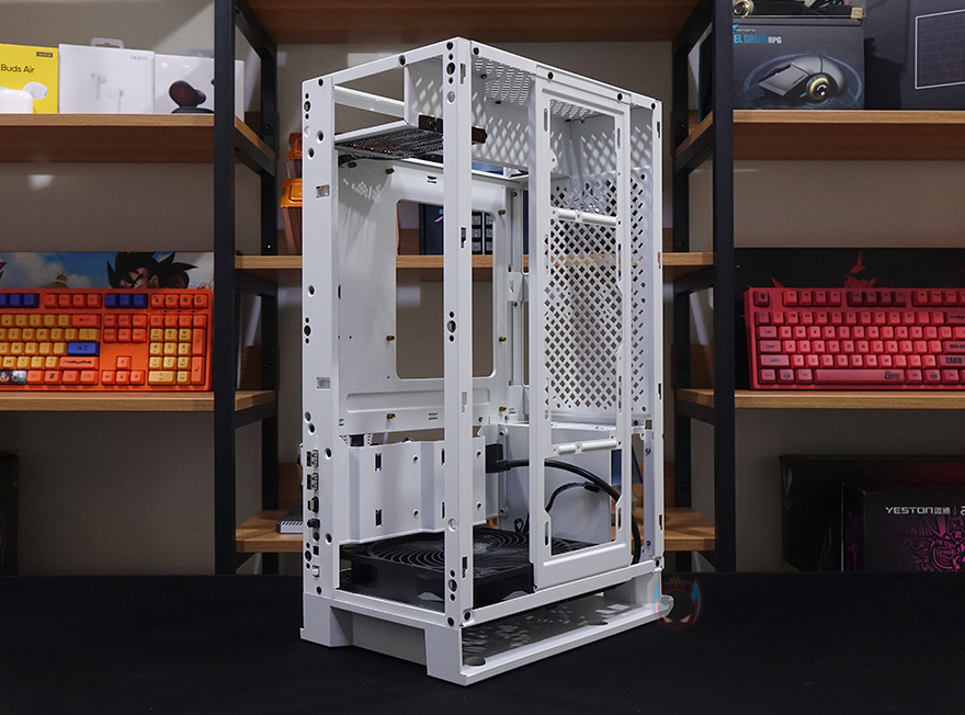 케이스 후면에는 전체적으로 메쉬(Mesh) 디자인을 적용하고 있는데, 맨 윗부분 오른쪽에는 메인보드 백패널 I/O가 상단에 배치되기때문에 키보드나 마우스, 모니터케이블 등을 후면으로 빼낼 수 있게 홀-처리를 해놨으며, 맨 아랫부분에는 전원케이블과 연결되는 포트가 배치되어 있습니다. 그리고, 후면 패널 역시 상단에서 고정된 핸드-스크류를 풀고 위로 올리면 쉽게 분리가 되죠. 역시 안쪽에는 필터가 적용되어 있습니다. 그리고, 케이스 밑바닥부분에는 미끄럼방지 및 진동소음 최소화를 위해 모서리 부근에 고무패드를 부착해놨으며, 밑바닥부분은 사실상 전체가 받침대 역할로 약 35mm 정도 공간을 두고 있습니다. 이 공간을 통해 하단 쿨링효과를 보는거죠. 그리고, 당연히 필터도 적용되어 있는데, 슬라이드 방식으로 쉽게 빼낼 수 있습니다.