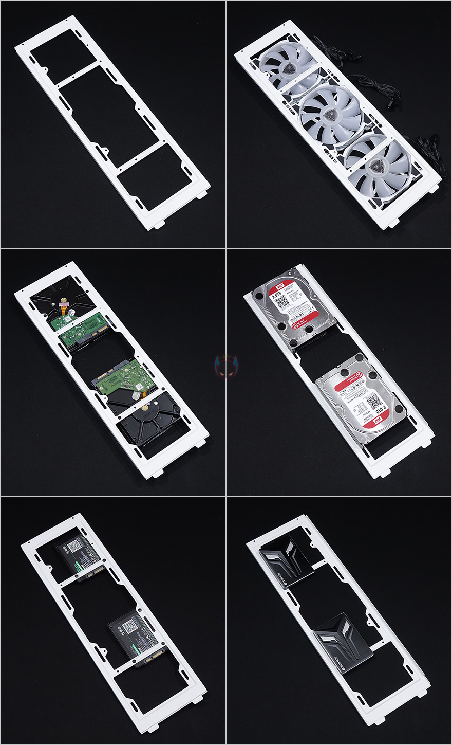 이제, 실버스톤 ALTA G1M 케이스의 내부를 살펴봐야겠죠. 앞서 전면패널을 쉽게 분리할 수 있었는데, 뒤에 조립부분에서 다시 확인하겠지만, 내부 전면은 그래픽카드가 장착되는 위치입니다. 그리고, 전면에서 봤을 때, 내부 오른쪽 패널에는 브라켓이 장착되어 있는데, 윗부분에 스크류를 풀면 쉽게 분리가 되고, 이 브라켓에는 팬, 저장장치, 수냉쿨러시 라디에이터까지 장착할 수 있죠. 팬 경우 120mm 3개를 장착할 수 있고, 저장장치는 3.5인치 HDD와 2.5인치 HDD/SSD 모두 최대 2개까지 장착이 가능하며, 수냉쿨러 사용시 최대 360mm 라디에이터까지 장착할 수 있습니다.