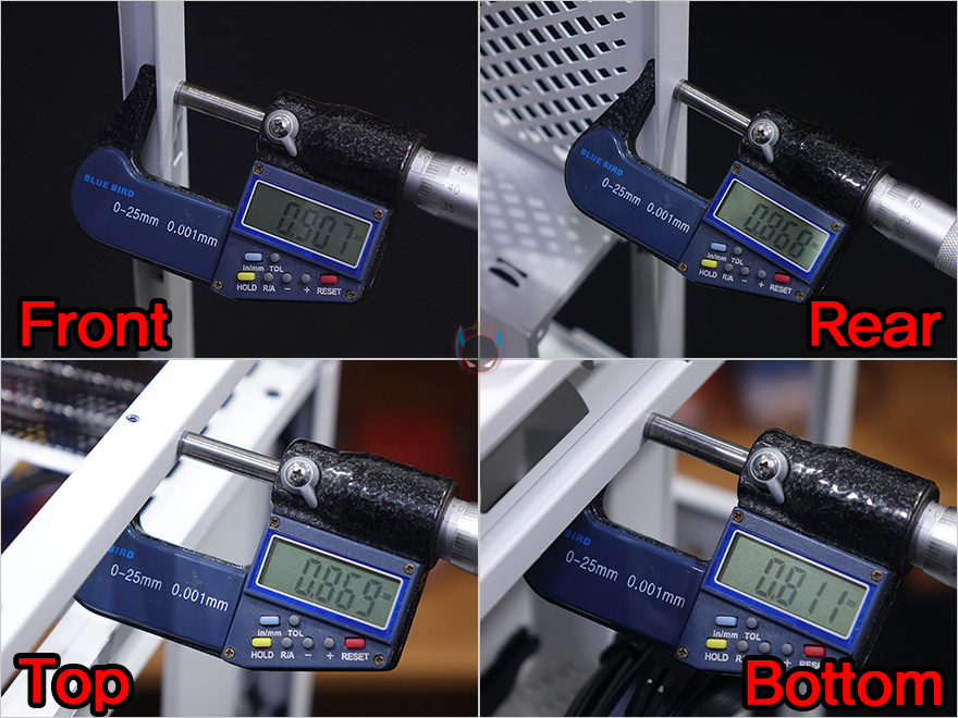 메인보드 트레이 후면에는 아랫공간에 케이블 정리 공간으로 중앙부분이 약 50mm정도로 가장 깊고, 양쪽으로 약 30mm 정도의 깊이를 가지고 있어서, 어느정도 케이블 정리를 하는데 있어서 도움이 될 것으로 생각되며, 내부 후면에는 추가적으로 팬이나 저장장치를 안쪽 방향에 장착할 수 있게 지원을 해주는, 팬 같은경우 120mm를 최대 2개까지 장착할 수 있고, 저장장치 경우 3.5인치 HDD와 2.5인치 HDD/SSD를 각각 최대 2개까지 장착할 수 있습니다. 물론, 팬과 저장장치 1개씩 함께 장착할수도 있죠. 그래서, 만약 타워형 쿨러를 사용한다면, 꼭 앞서본 사이드패널의 브라켓을 사용할 필요는 없겠습니다. 그리고, 맨 아래는 파워서플라이 자리로 Micro-ATX 메인보드가 장착되는 케이스지만 부피를 줄이기 위해 SFX 및 SFX-L 규격의 파워서플라이를 장착할 수 있게 지원하고 있죠. 끝으로, ALAT G1M 케이스에 사용된 샤시의 두께는 부위별로 측정한 결과 0.8~0.9T 두께로 미니타워 내구성을 위해 비교적 두꺼운 샤시를 사용했습니다.