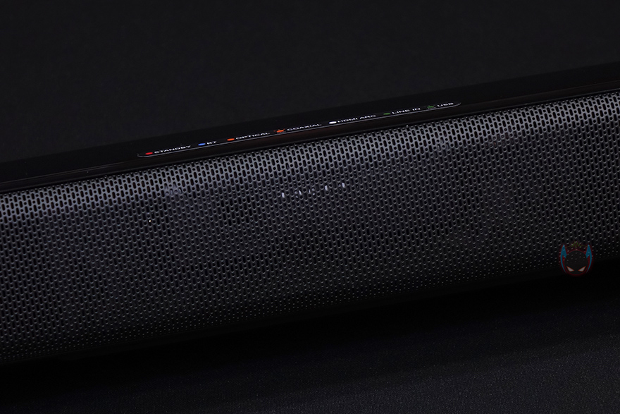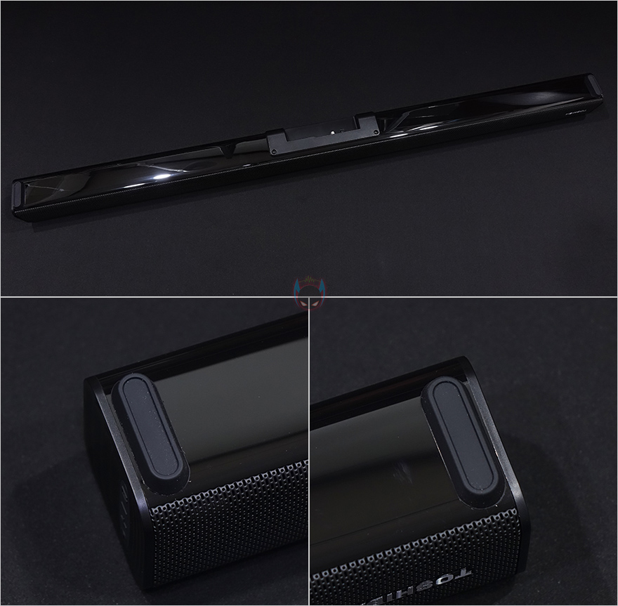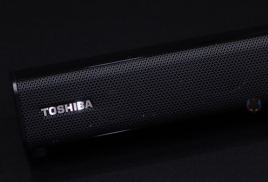 도시바 TS205 사운드바 외형을 살펴보면, 일단 길이는 950mm로 앞서 제품박스에서 38인치 사운드바라는 표기를 확인할 수 있었는데, 일반적으로 TV와 함께 사용할 때 이정도 길이면, TV는 최소 43인치(약 960mm)부터 사용하는게 비율적으로 어울린다할 수 있죠. 쉽게말해, TV보다 사운드바 길이가 짧아보여야 보기에 어색하지 않다라는겁니다. 좀 더 자세히 살펴보면, 전면에는 전체 메쉬 디자인과 함께 왼쪽에는 네임플레이트식으로 로고를 부착해놨으며, 내부에는 양쪽으로 각각 30W씩 사운드 출력이 되게 풀-레인지 스피커 2개가 적용되어 있습니다. 그래서, 총 60W 출력을 하는거죠.