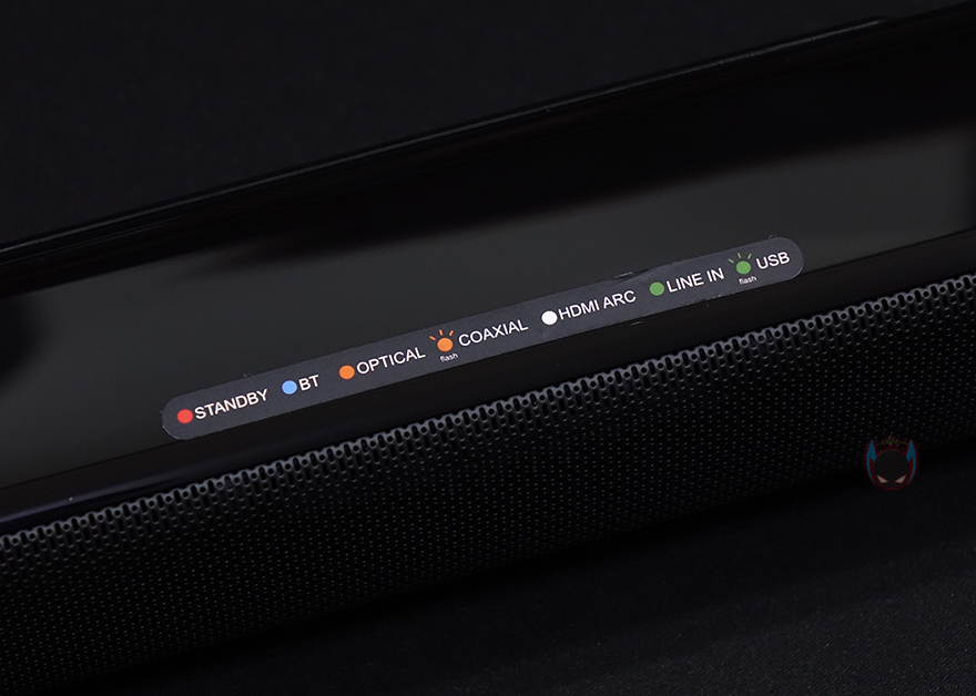 제품 후면에는 전원케이블과 연결되는 포트를 비롯해, 왼쪽부터 AUX, USB, HDMI ARC, 광(Optical), 동축(Coaxial) 입력 단자순으로 배치되어 있죠. 사용자 환경에 맞게 연결할 수 있도록 다양하게 단자 지원을 갖추었습니다. 물론, 블루투스 지원도 하기때문에 꼭 유선으로만 연결할 필요는 없습니다. 그리고, 밑바닥부분에는 진동소음 최소화를 위해 양쪽에 고무재질의 받침대도 부착되어 있습니다. 무선 리모컨 같은경우에는 전원부터 음소거/단자선택/블루투스/볼륨조절/재생컨트롤/EQ 기능까지 담고 있어서, 본체에 적용된 버튼들도 훨씬 사용하기가 수월하며, 건전지(CR2025)도 기본 포함되어 있죠.