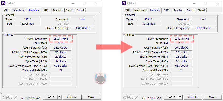 그리고, XPOWER Zenith RGB DDR4 메모리는 현재 3200MHz와 3600MHz 2가지 클럭으로 출시가 되었는데, 리뷰에 사용된 제품은 3600MHz 작동 제품으로 다시말해, XMP 프로파일이 적용되어 있습니다. 물론, XMP 프로파일은 일종의 오버클럭이기때문에 메인보드 CMOS에서 설정값을 불러와 적용해줘야하는데, 그전에 기본작동 클럭을 확인해보면, 2666MHz으로 작동되는 것을 확인할 수 있죠. 그래서, 기본작동될때 클럭과 메인보드 CMOS에서 XMP 프로파일을 불러와 3600MHz으로 오버클럭했을 때, 성능을 간단히 비교해보면, 성능이 빨라진 것을 확인할 수 있습니다.