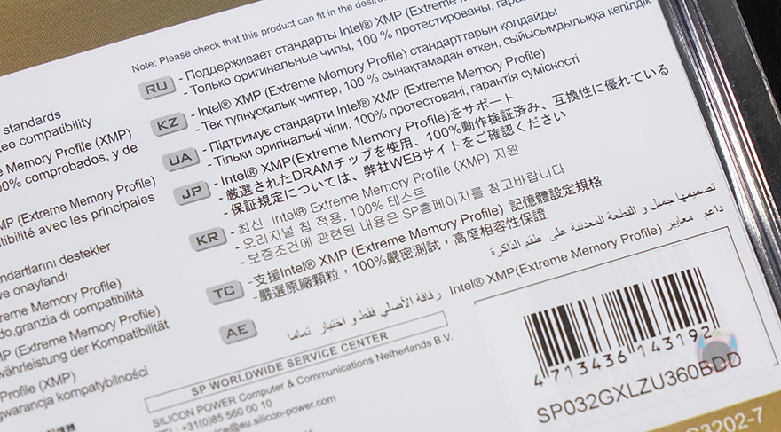제품팩키지는 먼저 나왔던 첫 RGB 메모리 XPOWER Turbine RGB처럼 박스형태가 아닌 메모리 상품에서 흔히 볼 수 있는 일종의 투명-캡 형태의 팩키지를 가지고 있습니다. 그래서, 바로, 안에 포장된 XPOWER Zenith RGB 메모리를 볼 수 있죠. 참고로, XPOWER Zenith RGB 메모리 제품구성은 싱글채널과 듀얼채널 2가지 방식으로만 출시되었고, 리뷰에서 보는 제품은 듀얼채널 그러니깐 메모리 2개가 1세트인 제품인데, 메모리 사이 팩키지 중간에는 메모리 클럭과 메인보드 제조사들의 ARGB 지원, 해당 제품의 메모리용량 표기를 확인할 수 있습니다. 박스 뒷면에는 한국어를 포함해 각 나라별 언어로 제품에 간단한 안내 문구 내용을 확인할 수 있죠.