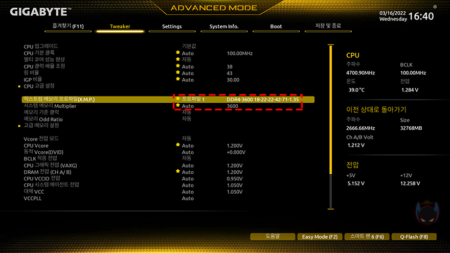 끝으로, XPOWER Zenith RGB DDR4 메모리가 XMP 프로파일을 적용하고 있어서, 사실상 오버클럭이 이미 적용된 상태지만, 메모리들은 수동으로도 사용자가 오버클럭을 할 수 있기때문에, Zenith RGB 메모리의 추가 오버클럭 여부를 확인해봤습니다. 확인결과, XMP 프로파일과 전압은 1.35V로 그대로 유지한 상태에서 최대 3900MHz까지 오버클럭이 가능한 것을 확인할 수 있었습니다.