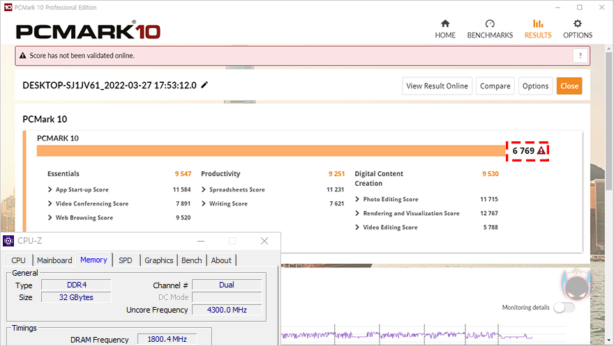 추가로 XPOWER Zenith RGB DDR4 메모리(3600MHz, 32GB)의 성능을 좀 더 비교해보자면, 먼저 나왔던 XPOWER Turbine RGB DDR4 메모리(3200MHz, 16GB)와 Passmark에서 간단히 메모리 성능을 비교해보면, 클럭과 용량에서 모두 앞서기때문에, 성능이 앞서는 것을 확인할 수 있고, 전체 시스템 성능 벤치마크 PCMark 10을 통해서도 클럭과 용량이 높은 XPOWER Zenith RGB DDR4 메모리가 더 좋은 결과값을 보여주는 것을 확인할 수 있습니다.