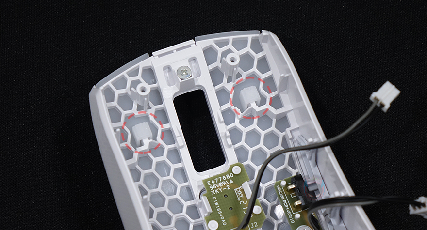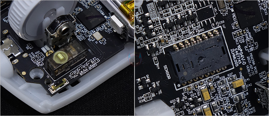 로켓 BURST Pro Air 무선 게이밍 마우스 내부를 잠깐 살펴보면, 상단커버 안쪽에는 앞서 외부에서 간접적으로 확인한 벌집모양의 바이오닉 쉘 디자인과 함께 기본 좌우버튼 클릭 정확성을 위해 ㅁ자형으로 처리된 지렛대를 확인할 수 있으며, PCB기판에는 총 3개의 LED가 적용되어있으며, 내장 배터리용량은 500mAh입니다. 그리고, 기본 좌우버튼 스위치는 1억 클릭수명의 로켓 타이탄(Titan) 광 스위치, 센서는 로켓 오울-아이 센서라고 언급하지만, 정확히는 PixArt사의 PAW3370을 로켓만의 스타일로 변형한 센서입니다. 그래서, DPI는 최대 19,000DPI까지 지원하죠.
