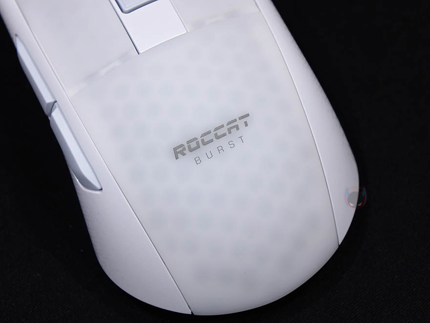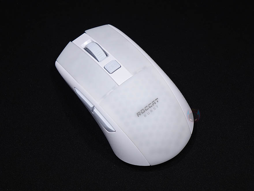 그럼, 로켓 BURST Pro Air 무선 게이밍 마우스를 본격적으로 살펴보면, 디자인은 앞서 언급했듯이 유선버전 BURST Pro에서 크게 벗어나지 않습니다. 거의 동일한 디자인을 가지고 있으며, 좌우대칭이지만 왼쪽 측면에 추가버튼이 적용되어 있기때문에 유선버전과 마찬가지로 오른손잡이 마우스입니다. 참고로 색상은 블랙과 화이트 2가지로 출시되었으며, 손바닥과 맞닿는 팜-레스트부분에는 로켓 로고와 함께 유선버전과 마찬가지로 반투명처리를 해서 내부에 벌집모양의 바이오닉 쉘 구조를 간접적으로 볼 수 있습니다. 물론, 반투명처리는 앞부분 기본 좌우버튼까지 그대로 이어지는 형태이며, 이전 유선버전과 달리 이번 무선버전에서 디자인이 좀 더 나아진 부분도 있는데 바로, 휠버튼/DPI버튼 구간의 주변 색상도 마우스 전체색상과 그대로 통일시켰습니다. 유선버전에선 화이트색상모델 이부분이 블랙색상으로 처리되어있죠. 그리고, 반투명된 부분들은 유선때와 마찬가지로 뒤에서 확인하겠지만, RGB 조명효과를 볼 수 있는 구간입니다.