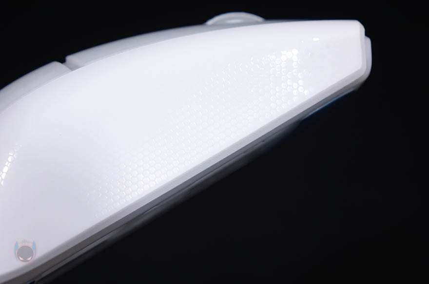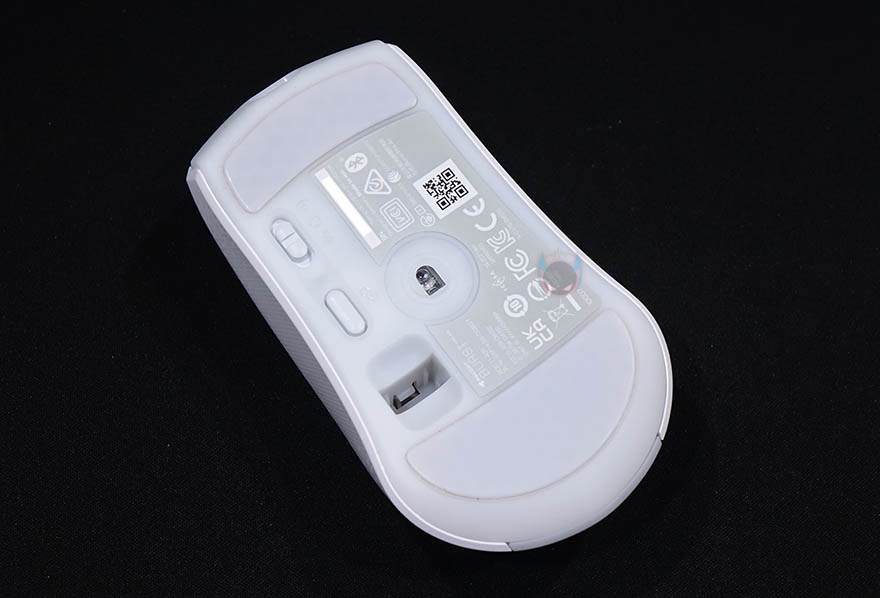 마우스 측면 역시 유선버전과 동일하게 벌집모양의 엠보싱 일정패턴 디자인을 처리해놨으며, 전면에는 충전케이블과 연결되는 USB Type-C포트가 적용되어 있습니다. 마우스 밑바닥도 테프론-피트는 유선버전과 동일하게 열처리된 순수 PTFE 글라이드이며, 개봉시에는 보호비닐이 부착되어 있기때문에 사용시에는 보호비닐을 제거해야합니다. 그리고, 가운데 광-센서 위치기준으로 왼쪽에는 2.4GHz 무선/전원Off/블루투스 모드로 선택할 수 있는 스위치와 바로 아래에 프로파일 전환버튼이 배치되어 있는데, 온보드 방식의 프로파일로 최대 5개를 지원합니다. 또한, 프로파일 전환버튼 아래에는 2.4GHz 무선 동글이를 수납할 수 있는 수납함도 적용되어 있죠. 참고로, 마우스 자체의 무게는 81g이고, 2.4GHz 무선 동글이를 수납한 상태의 무게는 83g입니다.