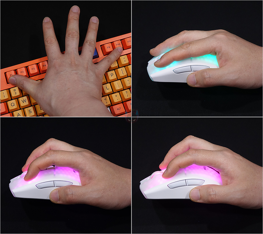 로켓 BURST Pro Air 무선 게이밍 마우스의 그립감 같은경우에는 필자의 손이 F10크기인데, 기본 그립인 팜-그립이 가장 무난했으며, 기본 좌우버튼구간이 분리설계 되어있기때문에 경우에 따라선 클로그립도 무난한 편입니다. 핑거그립의 경우에도 기본 좌우버튼 클릭은 가능하지만, 측면버튼과 거리가 멀어지기때문에, 사실상 팜과 클로그립에 좀 더 집중된다 할 수 있겠습니다. 그리고, 버튼클릭 압력은 약간 묵직한 느낌이 있기때문에, 가벼운 클릭압력을 선호하는 소비자에겐 조금 아쉬울 수 있습니다. 물론, 손가락에 부담감을 줄 정도는 아니죠.