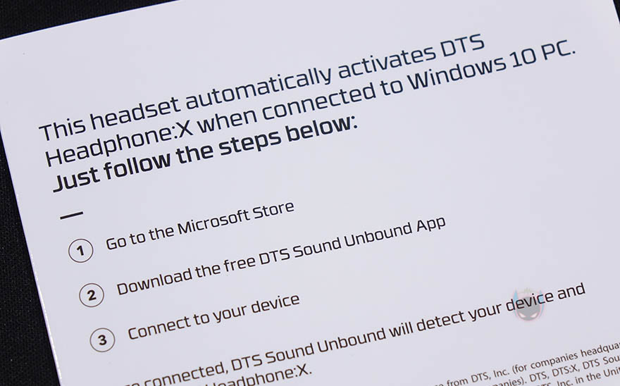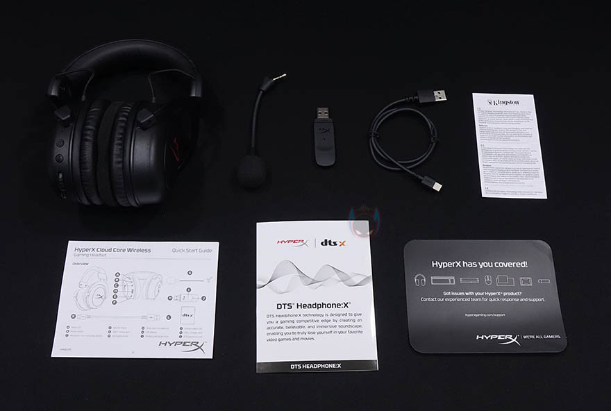 제품포장은 속박스와 함께 헤드셋은 포장처리가 되어있으며, 제품구성은 클라우드 코어 무선 게이밍 헤드셋, 분리형 마이크, 2.4GHz 무선 동글이, 충전케이블, 보증서, 제품설명서, DTS Headphone:X 설명서, 큐카드로 이루어져 있습니다. DTS Headphone:X 설명서는 어플 설치에 관한 내용을 담고 있는데, 마이크로소프트 스토어에서 다운로드 받을 수 있으며, 이부분은 뒤에서 다시 자세히 언급하겠습니다.