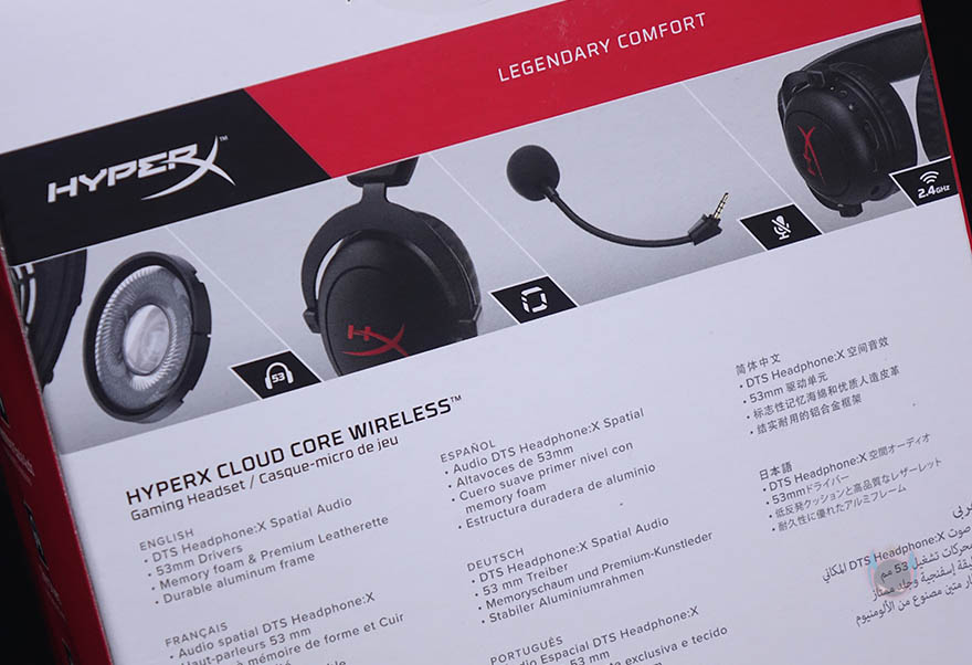 제품박스는 기존 클라우드 라인업 제품들처럼 전면에 클라우드 코어 무선이라는 모델명과 함께 제품 이미지를 담고 있으며, 아래에 주요 특징으로 시작에서 언급했던 무선버전으로 나오면서 DTS Headphone:X 기술이 적용된 것을 비롯해 메모리폼, 53mm 드라이버 유닛, 최대 20시간 무선 사용을 언급해놨습니다. 또한, 이번 클라우드 코어 무선은 먼저 나왔던 유선모델과 달리 PC환경에만 초점을 맞추고 있죠. 박스측면에도 이와 동일한 내용을 담고 있으며, 박스후면에도 DTS Headphone:X와 드라이버 유닛 외에 알루미늄 프레임, 분리형 마이크, 2.4GHz 무선방식을 추가로 언급하고 있으며, 아래에 제품 구성목록도 확인할 수 있습니다. 물론, 하이퍼엑스 게이밍 헤드셋하면 빠질 수 없는 디스코드와 팀스피크 인증도 확인할 수 있습니다.