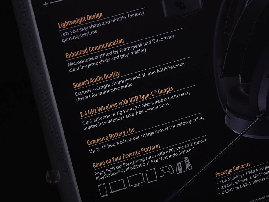 박스 후면에는 제품 풀샷 이미지와 함께 좀 더 자세히 제품 특징을 소개하고 있는데, 가벼워진 디자인, 음성채팅, 오디오 품질, 2.4GHz 무선 방식, 배터리, 다양한 플랫폼 지원을 언급하고 있습니다. 물론, 제품 구성목록도 확인할 수 있죠. 박스를 열어보면, 부속품들이 담기는 공간분배식으로 포장처리된 것을 확인할 수 있으며, 헤드셋은 별도의 포장이 한 번 더 되어있고, TUF Gaming H1 wireless 무선 게이밍 헤드셋, 2.4GHz 동글이, USB Type C to A 젠더, 충전케이블, 제품설명서, 보증서로 제품구성을 이루고 있습니다.