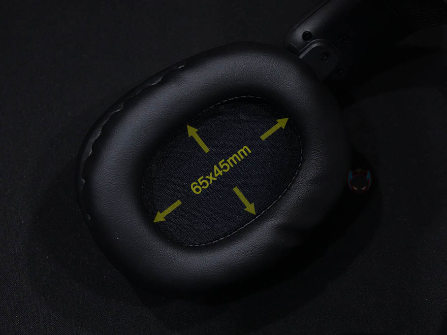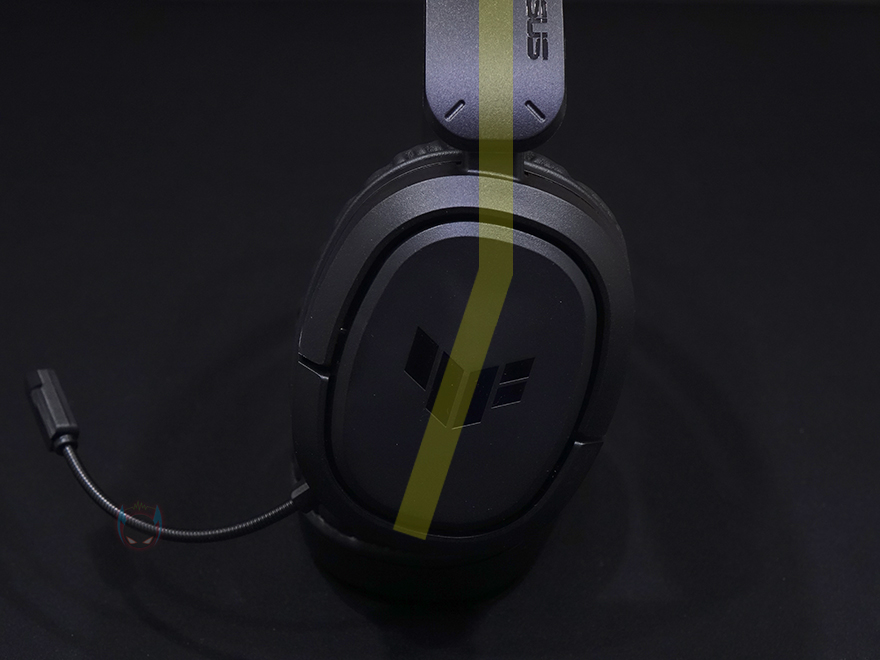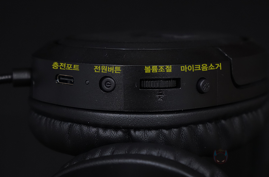 이어-컵 부분 역시 착용에 따라 자동으로 각도조절이 되도록 프레임 연결이 되어 있으며, 측면에서 보면 밴드와 이어-컵의 라인 각도가 꺽인 상태인 것을 확인할 수 있는데, 이 역시 인체공학적으로 사람의 귀 위치를 고려한 각도라 할 수 있습니다. 그리고, 이어-컵 바깥쪽에는 TUF 로고를 음각형태로 처리해놨으며, 왼쪽 이어-컵에는 충전케이블과 연결되는 USB Type-C 포트를 비롯해, 작동상태 LED 인디케이터, 전원버튼, 볼륨조절 노브, 마이크 음소거 버튼이 배치되어 있습니다. 또한, 왼쪽 이어-컵에 배치된 마이크는 다른 게이밍 헤드셋 제품들처럼 자유롭게 구부릴 수 있는 플렉시블 형태이며, 이어-컵 안쪽 이어-패드는 편안한 착용감을 위해 인조가죽처리의 쿠션으로 안쪽 귀를 밀폐해주는 공간은 약 65x45mm 크기를 가졌습니다. 그리고, 내부에는 40mm 네오디윰 드라이버 유닛이 탑재되었는데, 먼저 나온 TUF Gaming H3 wireless는 50mm로 사이즈가 줄어들었죠. 하지만, 반대로 임피던스는 오히려 60Ω으로 높아졌기때문에, 사운드 선명도에선 좀 더 좋아졌다할 수 있겠습니다.