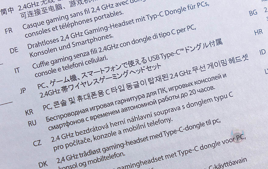 제품팩키지는 박스형으로 전면에는 모델명과 함께 제품의 측면 이어-컵 이미지를 담고 있는데, 먼저 나온 TUF Gaming H3 wireless 모델과 유사하다라는걸 알 수 있습니다. 뒤에서 디자인을 하나씩 살펴보겠지만, 전체적으로 TUF Gaming H3 wireless의 라이트 버전이라는 느낌을 받습니다. 전면에는 이외에도 플스5 지원, 디스코드와 팀스피크 인증을 확인할 수 있고, 측면에 제품의 기본사양으로 무선 방식과 주파수 대역, 임피던스, 드라이버유닛 크기, 배터리용량 등을 확인할 수 있죠. 또한, 바로 옆에는 한국어를 포함해 각 나라별 언어로 제품 타이틀 문구를 표기해놨습니다.