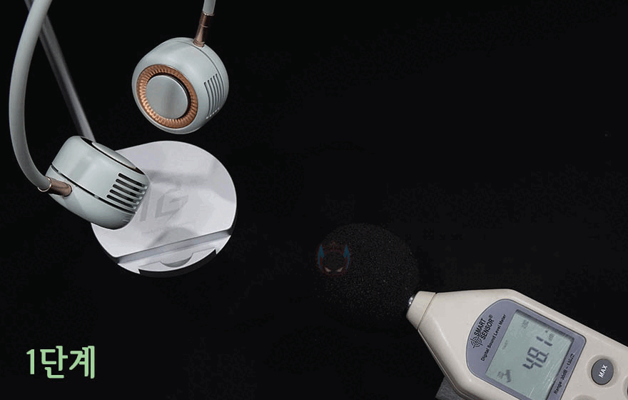 넥밴드 선풍기를 착용하면, 보통 선풍기에서 귀까지의 거리가 10cm 내외로 되는데, 데이지 넥 밴드를 10cm 거리를 두고 단계별로 소음측정을 해 본 결과, 1단계는 약 48dB, 2단계는 약 59dB, 3단계는 약 62dB로 소음은 발생하지만, 주변 대화는 충분히 들릴정도라 거슬리진 않겠습니다. 마지막으로, 작동시에는 충전포트 옆에 배치된 LED 인디케이터가 화이트 색상으로 점등되고, 충전시에는 레드 색상으로 점등됩니다.