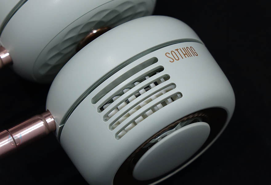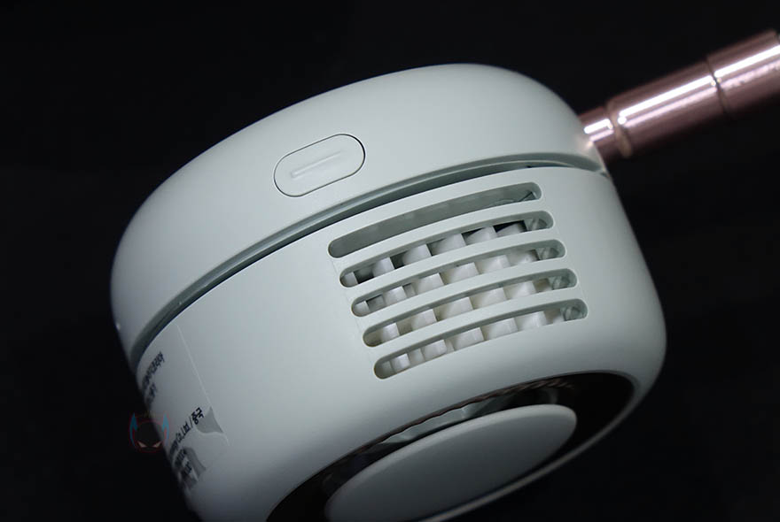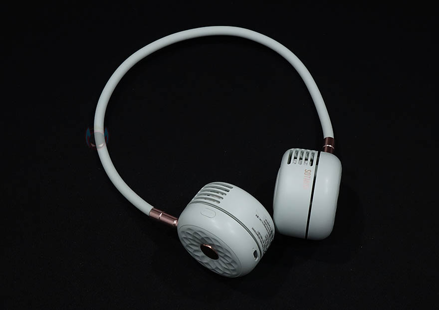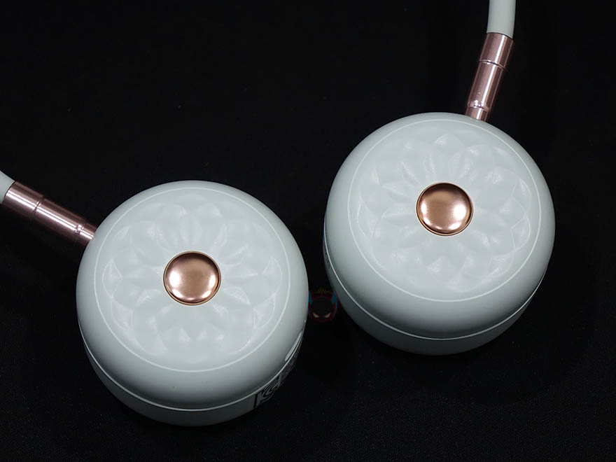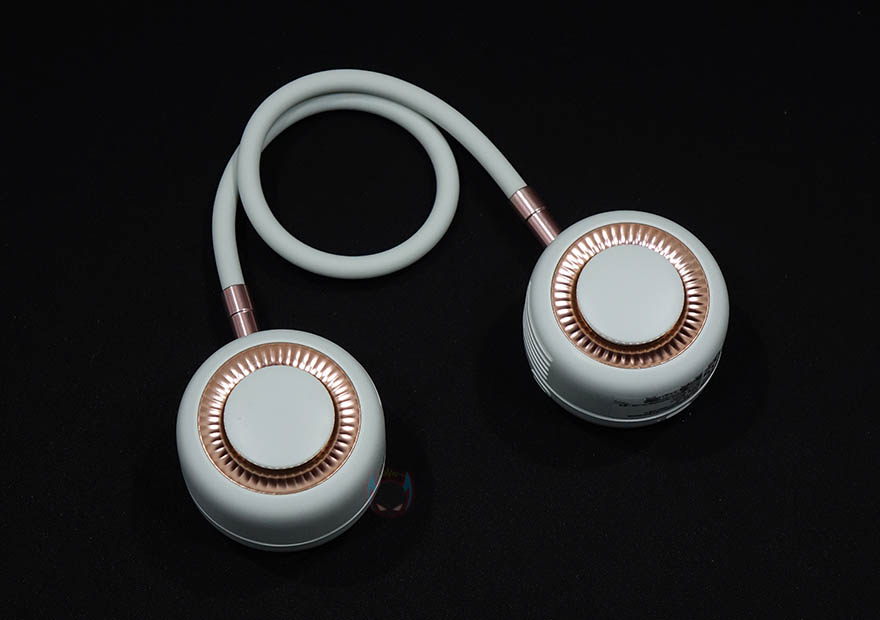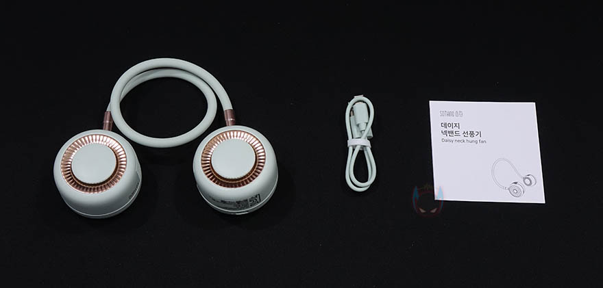 바람이 나오는 선풍기 부분은 원형 디자인으로 바깥쪽은 음각형태로 꽃모양의 디자인을 적용하고 있으며, 가운데 포인트로 브라운 메탈릭 색상을 적요하고 있는데, 선풍기와 케이블 연결부에도 포인트로 적용하고 있습니다. 일반적인 넥밴드 선풍기에선 좀처럼 보기드문 디자인이라 고급스러운 느낌이 있습니다. 그리고, 안쪽 흡입구부분도 브라운 메탈릭 색상을 적용하고 있으며, 바람이 나오는 측면 송풍구에는 반 폐쇄 설계로 이물질이 들어가지 않도록 했으며, 내부에는 60개 날개를 가진 블래드리스 터보-팬이 적용되어 있습니다. 또한, 선풍기 한쪽에는 버튼과 충전포트, LED 인디케이터가 적용되어 있죠. 버튼은 전원과 풍량조절 겸용으로 한 번씩 누를때마다 전원 On→1단계→2단계→3단계→전원 Off 순으로 작동됩니다. 그리고, 제공되는 충전케이블 역시 제품 색상과 맞춰서 동일하게 적용하고 있으며, USB 인터페이스는 Type-C to A로 적용되어 있습니다.