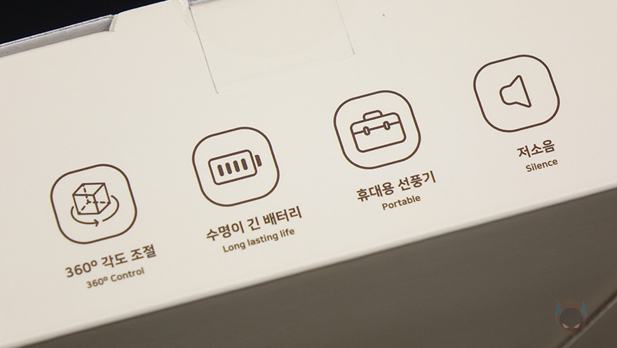박스를 열어보면, 제품이 흔들리지 않게 틀-포장과 함께 데이지 넥 선풍기와 부속품은 각각 비닐포장으로 처리되어 있으며, 제품구성은 자사의 다른 선풍기 제품들처럼 본 제품, 충전케이블, 제품설명서로만 이루어져 있습니다.