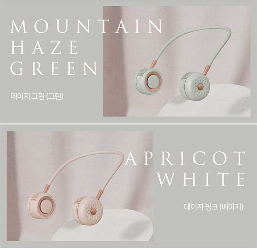 그럼, 소싱 데이지 넥밴드 선풍기를 살펴보면, 일단 색상은 그린과 베이지 2가지 색상으로 출시되었는데, 색상별로 데이지 그린, 데이지 핑크라고 명칭하고 있습니다. 그리고, 개봉시 그대로 선풍기를 꺼냈을 때 디자인만큼 눈에 띄는 부분이 바로 목에 걸게 되는 케이블부분인데, 한 번 감겨있는 형태로 바로 자유롭게 구부릴 수 있는 플렉시블 케이블입니다. 요즘 스마트폰 거치대 상품에서 자유롭게 구부릴 수 있는 플렉시블과 유사한 형태로 사용자가 원하는대로 자유롭게 구부릴 수 있죠. 이렇게 케이블을 자유롭게 구부릴 수 있기때문에, 고정형 케이블보다 사람 체형에 따라 자유롭게 착용할 수 있겠습니다. 물론, 선풍기부분도 360˚까지 회전시킬 수 있습니다. 그리고, 케이블 마감도 피부에 자극적이지 않게 ABS소재를 사용했죠.