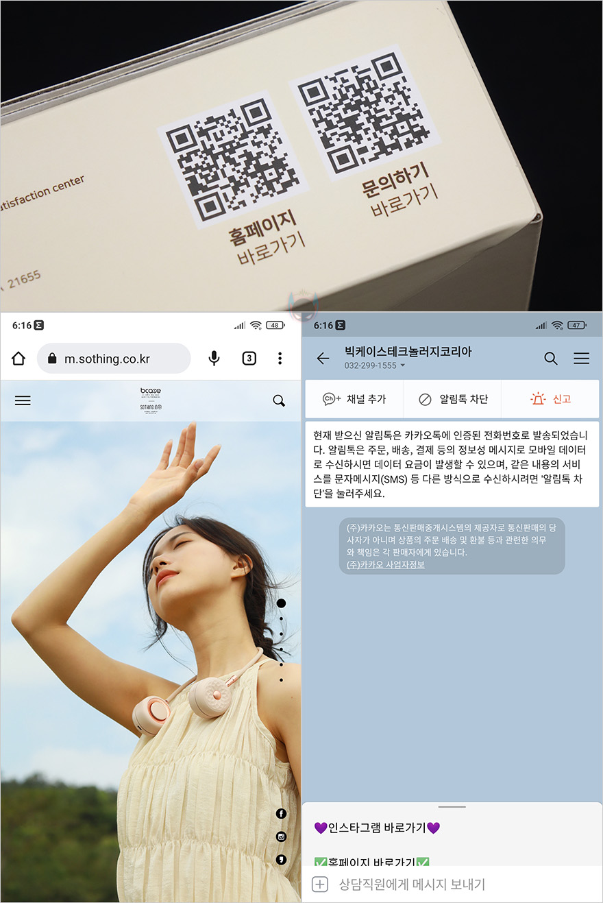 제품박스에는 모델명과 함께 작년 브랜드대상 표기까지 확인할 수 있어서, 점점 소싱과 빅케이스테크놀러지코리아의 위상이 높아졌다라는걸 알 수 있으며, 한쪽 측면에는 데이지 넥 선풍기 주요 특징으로 360도 각도조절, 배터리 수명, 휴대용 선풍기, 저소음을 표기해놨습니다. 그리고, 나머지 다른 측면에선 제품의 기본사양과 빅케이스테크놀러지코리아 홈페이지와 상품문의를 할 수 있게 QR코드를 표기해놨죠. 참고로, 문의하기는 카카오메신저로 연결되는데, 메신저로 연결되면, 추가로 소싱 공식 SNS 인스타그램(https://www.instagram.com/sothing_official/)으로도 접속할 수 있습니다.