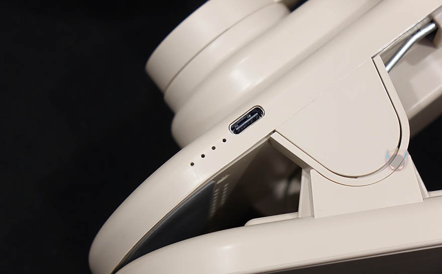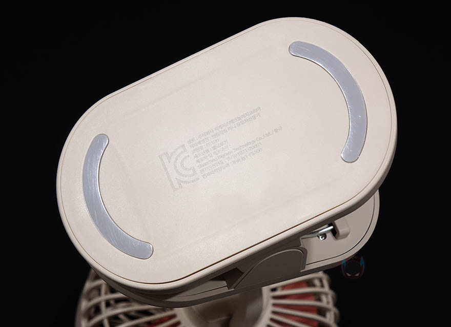 이 외에도 집게 전면에는 버튼 2개가 배치되어 있는데, 왼쪽에는 좌우회전 버튼, 오른쪽에는 전원/풍량조절 버튼으로 풍량조절은 앞서 제품박스에서 확인했듯이 3단계 조절로 버튼을 한 번씩 누를 때마다 전원 On→1단계→2단계→3단계→전원 Off 순으로 작동됩니다. 그리고, 집게 오른쪽 측면에는 충전케이블과 연결되는 USB Type-C 포트가 적용되어 있으며, 포트 바로 앞쪽에는 배터리 상태를 확인할 수 있는 LED 인디케이터도 적용되어 있죠. 또한, 이번 제품이 기본 컨셉은 클립형 선풍기지만, 집게 밑바닥부분에도 미끄럼방지 실리콘패드가 부착된 것을 확인할 수 있어서, 그냥 바닥에 놓고 사용할수도 있습니다. 쉽게말해, 탁상용 겸용인거죠. 물론, 사용전에 부착된 보호비닐은 제거해야합니다.